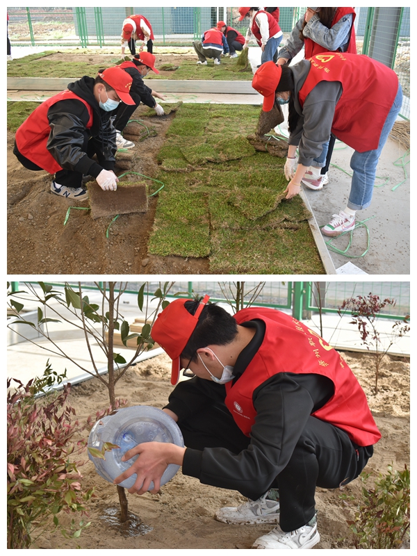 在实训大棚内,同学们在江老师的指导下,纷纷当起了“园艺工程师”,在沙坑内铺设草坪、种上绿植,有的挖坑,有的扶树苗,有的浇水……,在大家的通力合作下,树苗逐渐“亭亭玉立”在沙土上,这一片新生的春意为校园注入了勃勃生机。