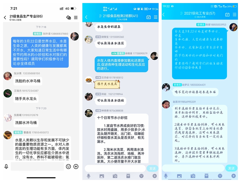 各班级通过召开主题班会向同学们普及节约用水方面的知识,从水在经济社会和生活中的作用,到世界水资源现状和中国缺水情况,号召同学们在日常生活中节约用水,保护水资源。同学们也在班级群展开了激烈讨论,积极发表自己在日常生活中的节水小妙招,坚持一水多用,珍惜每一滴水。水在我们生活中是不可或缺的,我们美好的生活离不开水,抗击病毒更离不开水,在同心抗疫的这段特殊时期,青年大学生更应以自己的切实行动节水爱水护水。