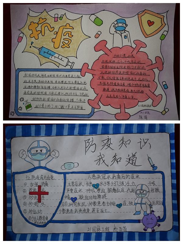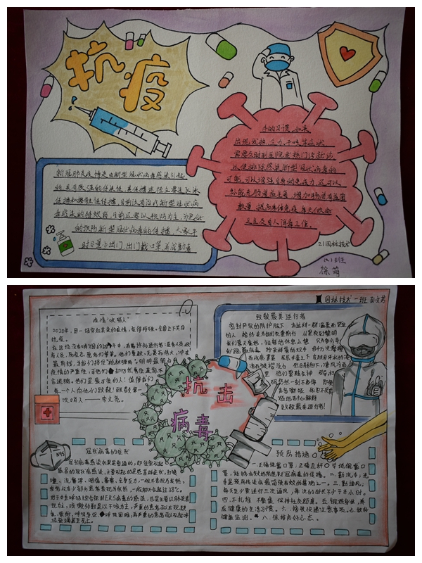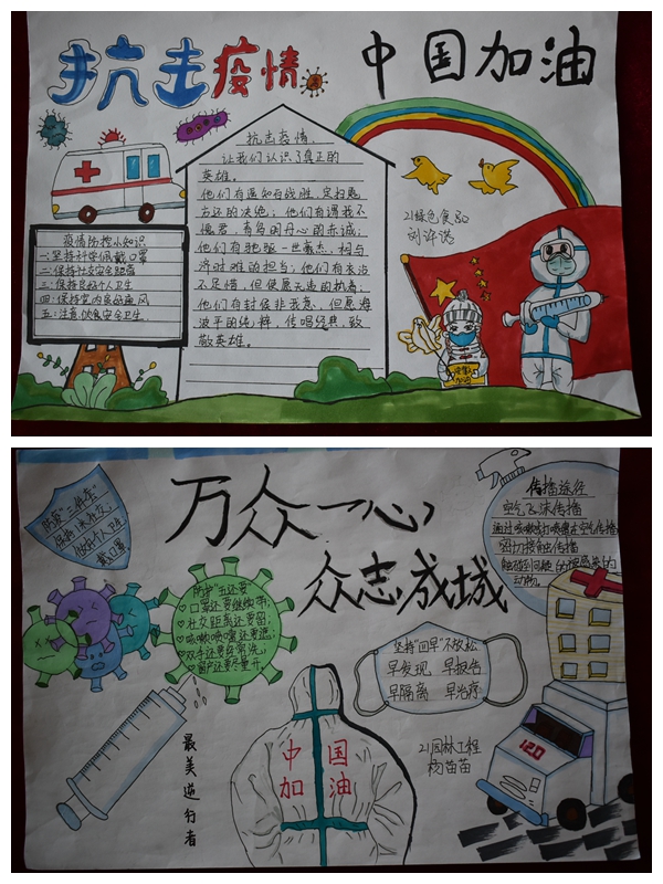 各班的手抄报紧紧围绕疫情防控主题,采用多种途径查阅、收集防疫有关资料,精心选材并巧妙构思,一幅幅作品设计新颖,图文并茂,内容丰富,精彩纷呈。有的介绍了此次病毒的特点与传播途径,有的讲述了如何做好自我保护,一笔一画均表达了对医务工作者的敬意和对战胜疫情的信心。