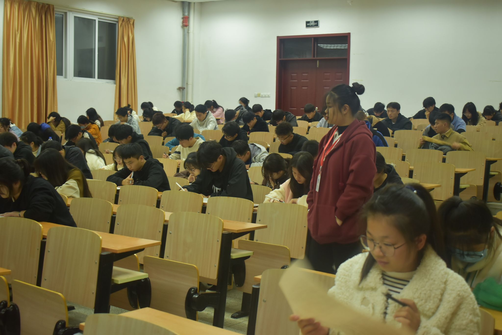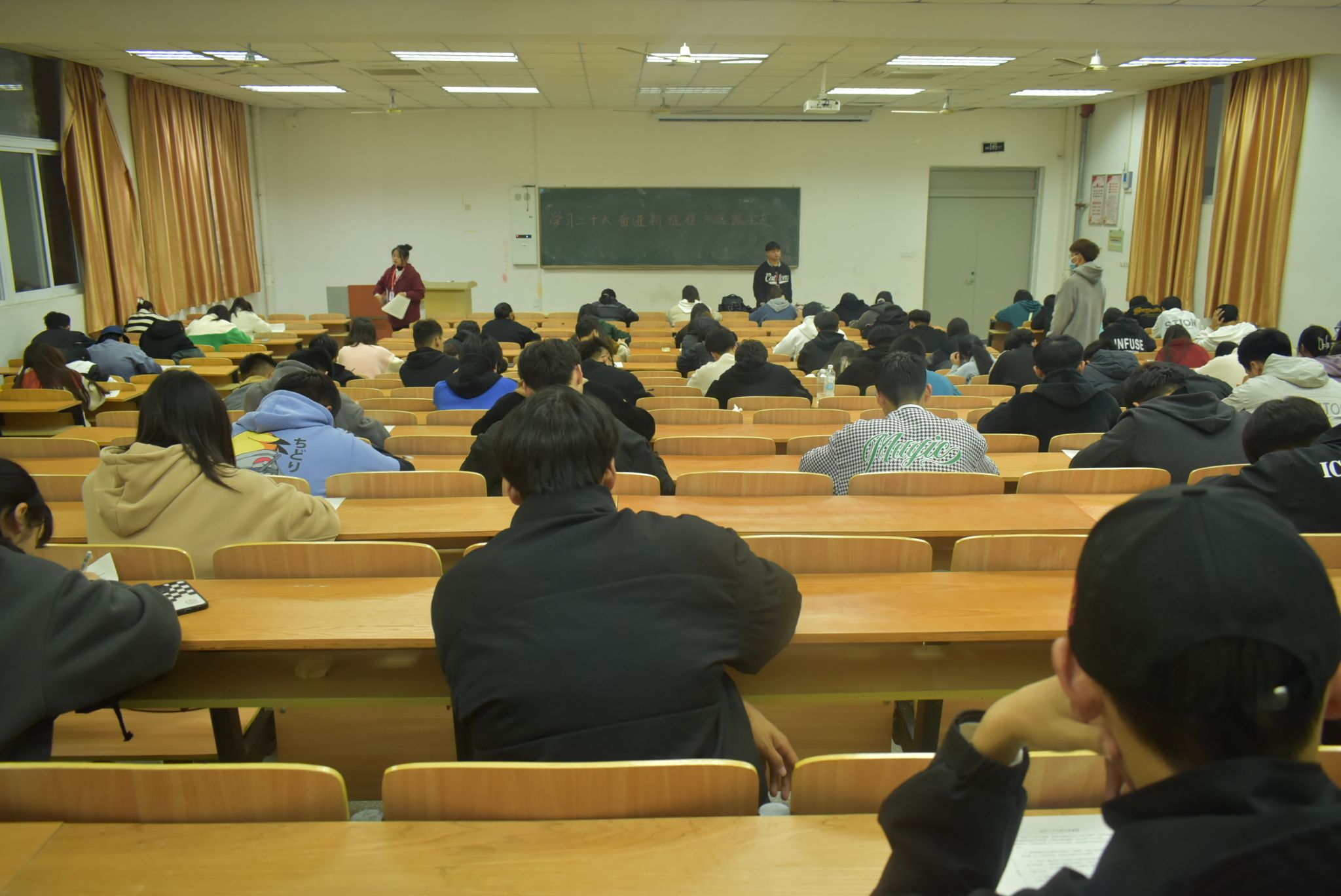 晚上7点,线下知识竞赛活动正式开始,120名学生齐聚考场认真答题,本次知识竞赛主要以党的二十大精神为核心内容,结合党的二十大报告、《中国共产党章程》等知识要点,以“答题竞赛”的形式夯实同学们的相关基础知识,进一步坚定理想信念。