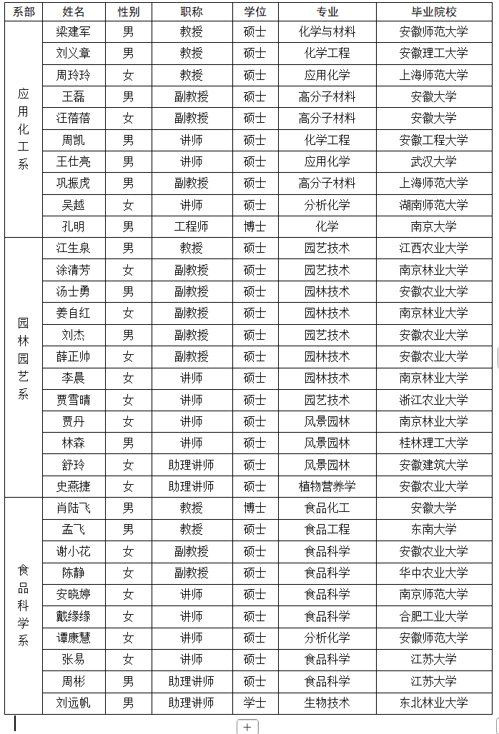 学院历史 食品与环境工程学院的前身为2003年成立的基础部化工教研室,2012年3月成立了生化工程系,2014年4月,更名为食品与环境工程系,2019年8月更名为食品与环境工程学院。 学院简介 食品与环境工程学院辖三个系和一个省级示范实验实训中心,分别是:应用化工系、园林园艺系、食品科学系和生化实训中心。共开设8个专业:应用化工技术(中央财政支持重点建设专业)、建筑材料检测技术、环境工程技术、园艺技术、园林技术、园林工程技术、绿色食品生产与检验、食品营养与检测。有教职工31人,其中教授4人,副教授10人,讲师12人,高级双师型教师10人、高级技师9人,技师8人;硕士26人,博士1人;省级教学名师2人,省级教坛新秀3人,省级专业带头人2人,师资力量十分雄厚。 近年来,食品与环境工程学院在师资队伍建设、人才培养、专业建设、教育教学改革、技能大赛等方面取得了突出的成绩:拥有中央财政支持重点建设专业1个;创新发展行动计划骨干专业1个、省级特色专业2个;建有省级滁菊大师工作室、省级特派员工作站、省级校内生产性实训基地等;出版专著5部;省级示范实验实训中心1个;省级教学研究项目4项;省级教学团队1项;省级自然科学研究重大项目2项、重点项目15项;省级拔尖人才2人、省级优秀青年人才支持计划重点项目9项;国家级职业技能大赛二等奖5项、三等奖4项,省级职业技能大赛二等奖、三等奖多项等。 目前,学院的毕业生始终供不应求,培养的学生一直受用人单位青睐,就业率连续10年始终保持在97%以上。 食品与环境工程学院师资队伍一览表(专业教师):