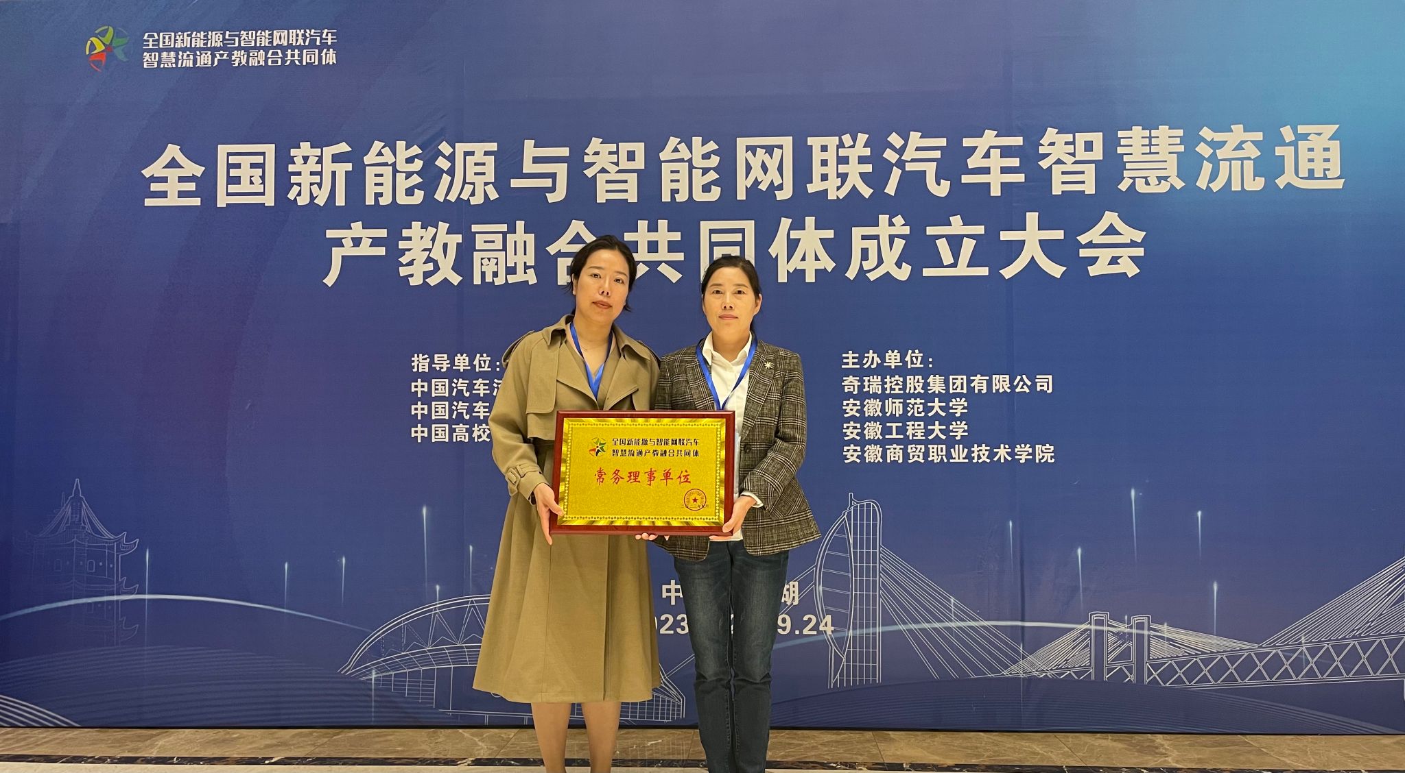 商学院赵荣和曹洁两位教师代表学校数字营销教学团队受邀参加共同体启功仪式。安徽省教育厅高等教育处二级调研员檀俊,芜湖市人民政府副秘书长孙万胜,安徽师范大学党委常委、副校长高峰,安徽工程大学党委常委、副校长凤权,奇瑞控股集团有限公司奇瑞大学执行校长、中国汽车工业协会职业技能分会副会长李康,安徽共生物流科技有限公司董事长卢立新、奇瑞盈丰投资人力运营总监尹杰、中国高校校办产业协会产教融合分会副会长曾黎明,全国职业院校教育类专业教指委副主任李忠,共计94所本科院校、高职院校以及行业企业近200名代表参加会议。共同体启动现场,全体参会代表审议并表决通过了《全国新能源与智能网联汽车智慧流通产教融合共同体章程(草案)》,表决通过第一届理事会组成人员名单。在热烈的掌声中,共同体正式启动,与会领导为共同体成员单位集中授牌,Beat365被授予全国新能源与智能网联汽车智慧流通产教融合共同体常务理事单位。
