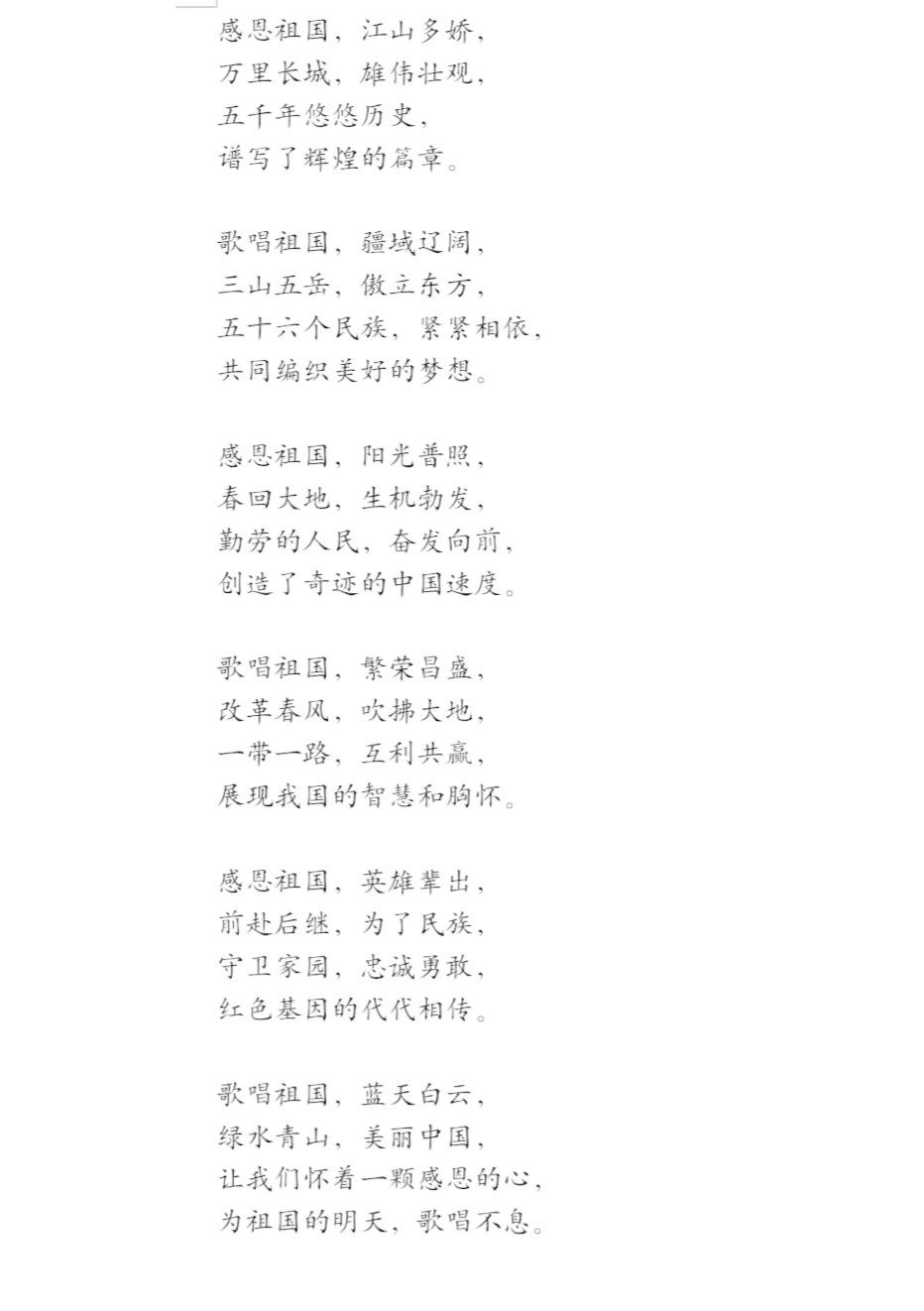 为加强爱国主义教育,增强学生爱国热情,培养学生良好的爱国情操。在国庆节到来之际,商学院学生会于10月5日开展“怀感恩之心,唱祖国颂歌”主题诗歌创作线上比赛。