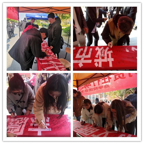本次活动,商学院团总支组织志愿者在宿舍前主要路段设置志愿者服务站,以横幅签字为主要形式开展宣传活动,号召大家围绕创建文明城市要求,从自身做起,说文明话、办文明事、做文明人,让创文氛围感染群众,让创建文明城市意识深入人心。横幅签名活动也得到了同学们的大力支持,纷纷前来在“志愿服务功在当代,城市文明利及千秋”的红色横幅是留下了自己的姓名,感受到了同学们对创建文明城市的信心与决心。
