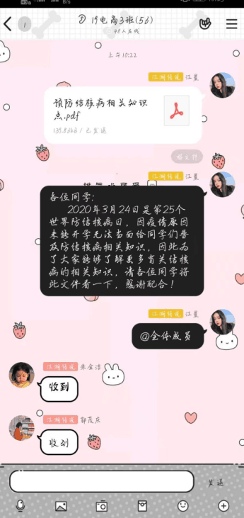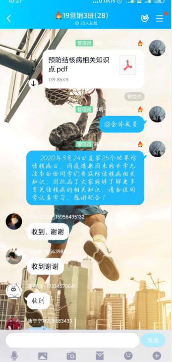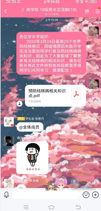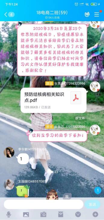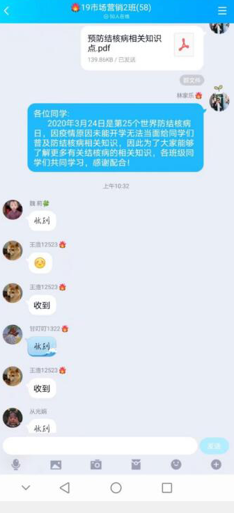 活动前一天,学生会成员开始从网上和各个软件中搜索一些关于预防结核病的相关知识与问题,总结在一起,并在预防结核病当天在班长群里发布预防结核病相关知识的文件,告诉各个班长发布到各自的班级群里,在自己了解的同时督促带领着同学们一起去学习预防结核病的相关知识,文件发布后,同学们在群里展开了激烈的讨论,增强了大家对于结核病的理解,心中都有如何预防如何避免结核病的方法。同学们在参加线上活动的同时,了解到了有关结核病的各种知识,为预防结核病在校园传播打下了基础。