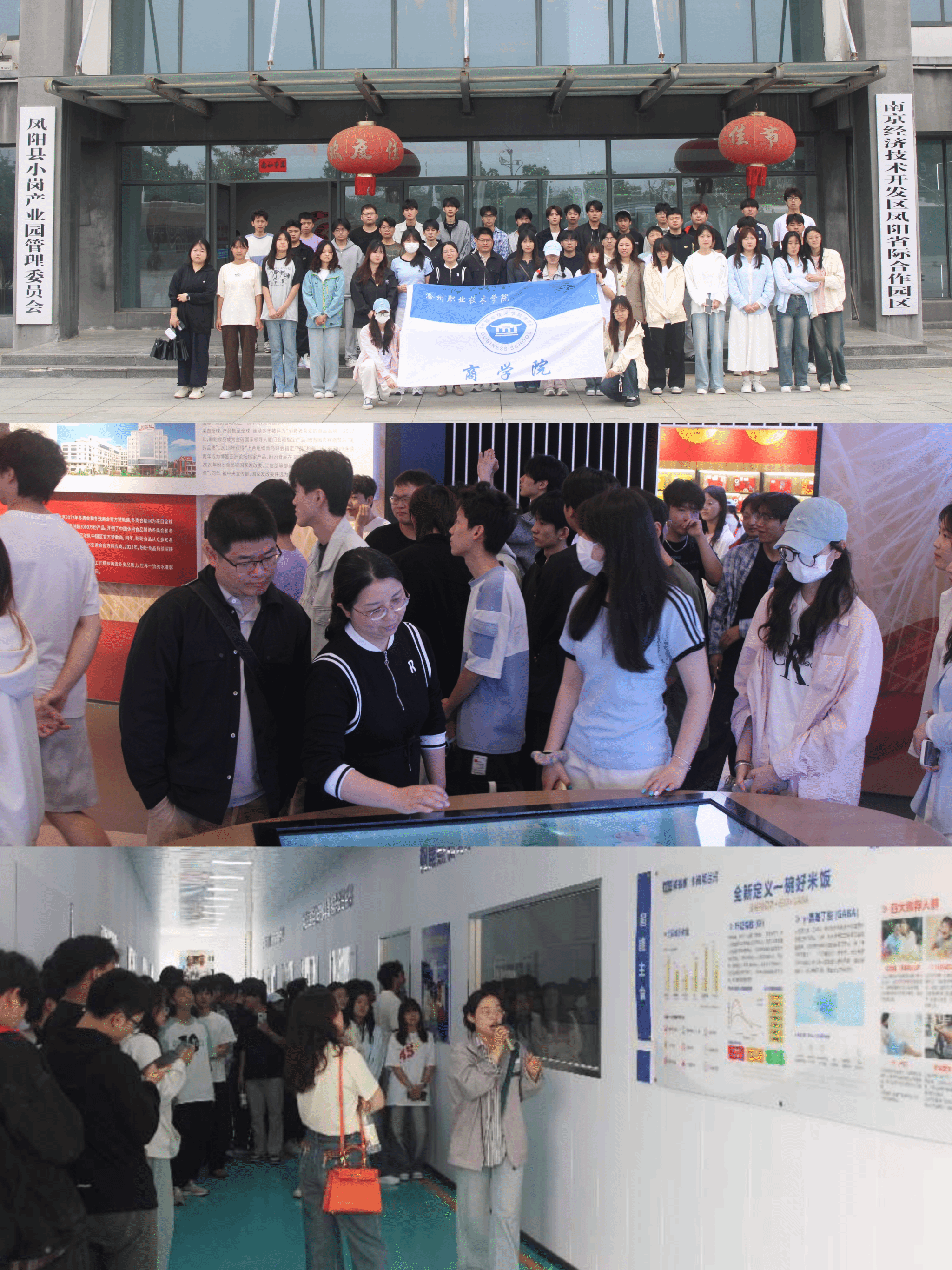 活动首站,一行人来到安徽省小岗国家农业科技园区。在小岗产业园区办公室主任丁欧亚的引导下,大家走进安徽省小岗盼盼食品有限公司。讲解员生动讲述了盼盼从创业初期到成为行业知名品牌的发展历程,让师生们深刻感受到企业勇于创新、拼搏奋进的精神。随后,师生们参观了盼盼的生产车间,现代化的生产设备、规范的操作流程,让大家对食品生产有了更直观的认识。