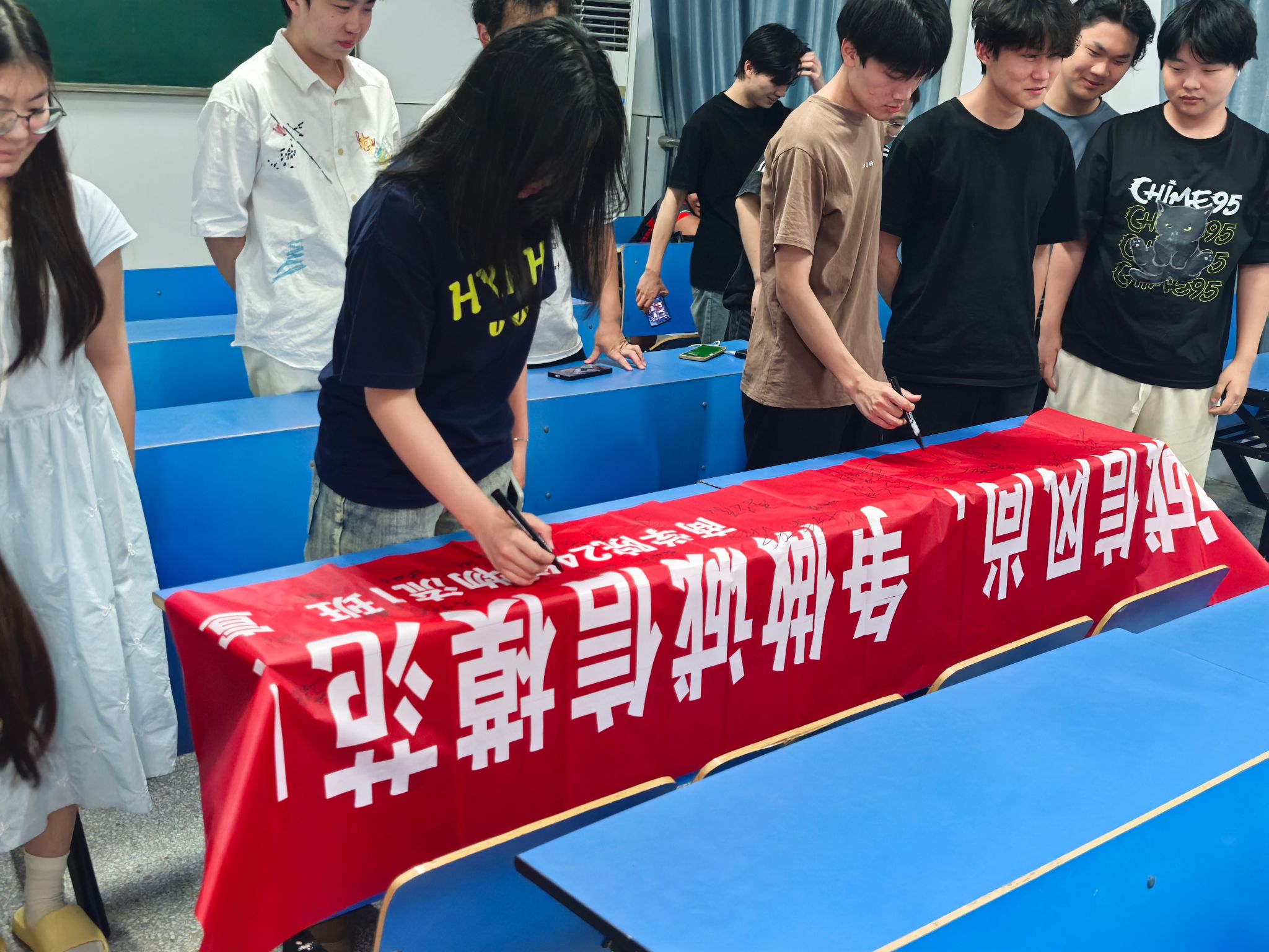 为弘扬社会主义核心价值观,营造校园诚信文化氛围。2025年5月29日商学院24级物流1班积极响应学院“诚信宣传月”号召,在致真楼一楼大厅组织开展了“倡导诚信风尚,争做诚信模范”横幅签字活动,号召同学们践行诚信理念,共建和谐校园。