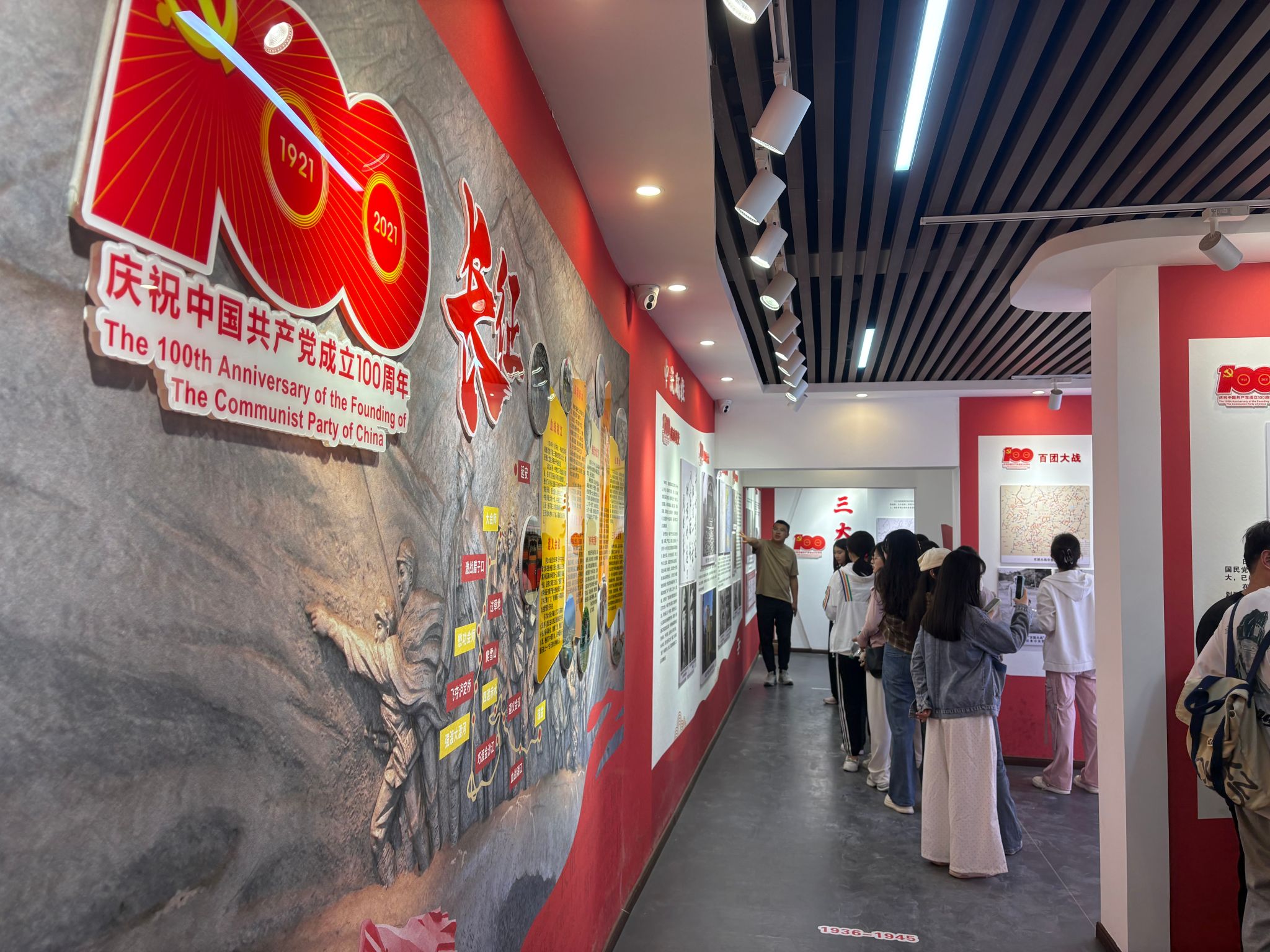 实践团队随后走进三界镇展览馆。展厅内,百年党史与军事发展历程通过实物模型与数字技术生动呈现。在“纪律建设”专题展区,师生们驻足研读党的首份反腐文件《坚决清洗贪污腐化分子》(1926年)复制件,通过纪律演变的脉络,理解“铁纪铸党魂”的深刻内涵。