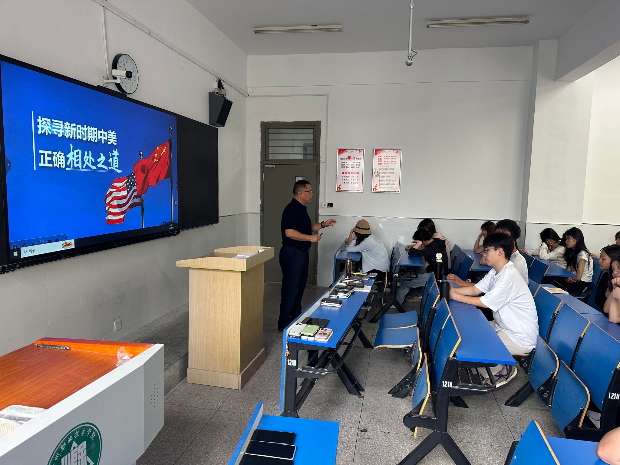 李超在课程中首先给同学们介绍了近代中美关系的发展历程。详细解读了中美关系的发展现状和前景。并强调新时期中美关系的正确发展要以习近平总书记提出的“三大原则、五根支柱、四条红线”为基础,努力做到相互尊重、和平共处、合作共赢。最后课程以“中美关系是世界上最重要的双边关系之一,中美如何相处,既关乎两国人民福祉,也关乎世界前途命运”的总结为结尾。