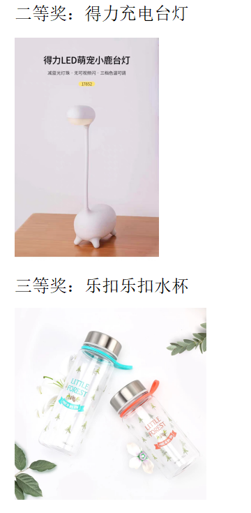 二等奖:每个项目各两名,奖励得力充电台灯一个。