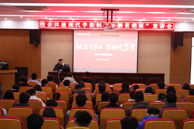 2019年12月2日中午,商学院与金鹏控股集团经过协商,针对本学期转到市场营销专业和原市场营销非金鹏现代企业学徒制班级的学生再次进行宣讲,对金鹏现代企业学徒制班级进行扩班,给予更多同学参与到金鹏现代企业学徒制合作班的机会。