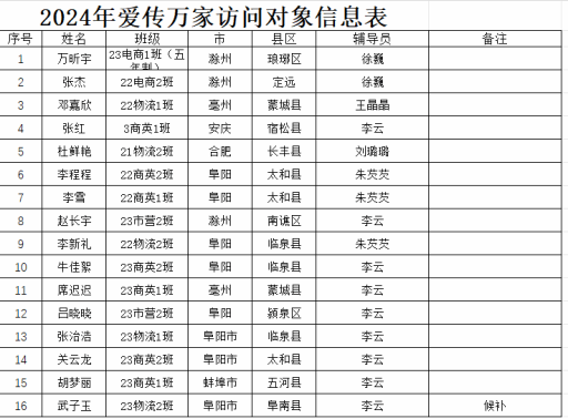 根据学校《关于摸排报送2024年“爱传万家”走访对象的通知》要求,商学院经过摸排和学管会议讨论,初步拟定上报名单,现予以公示,公示名单详见下表:
