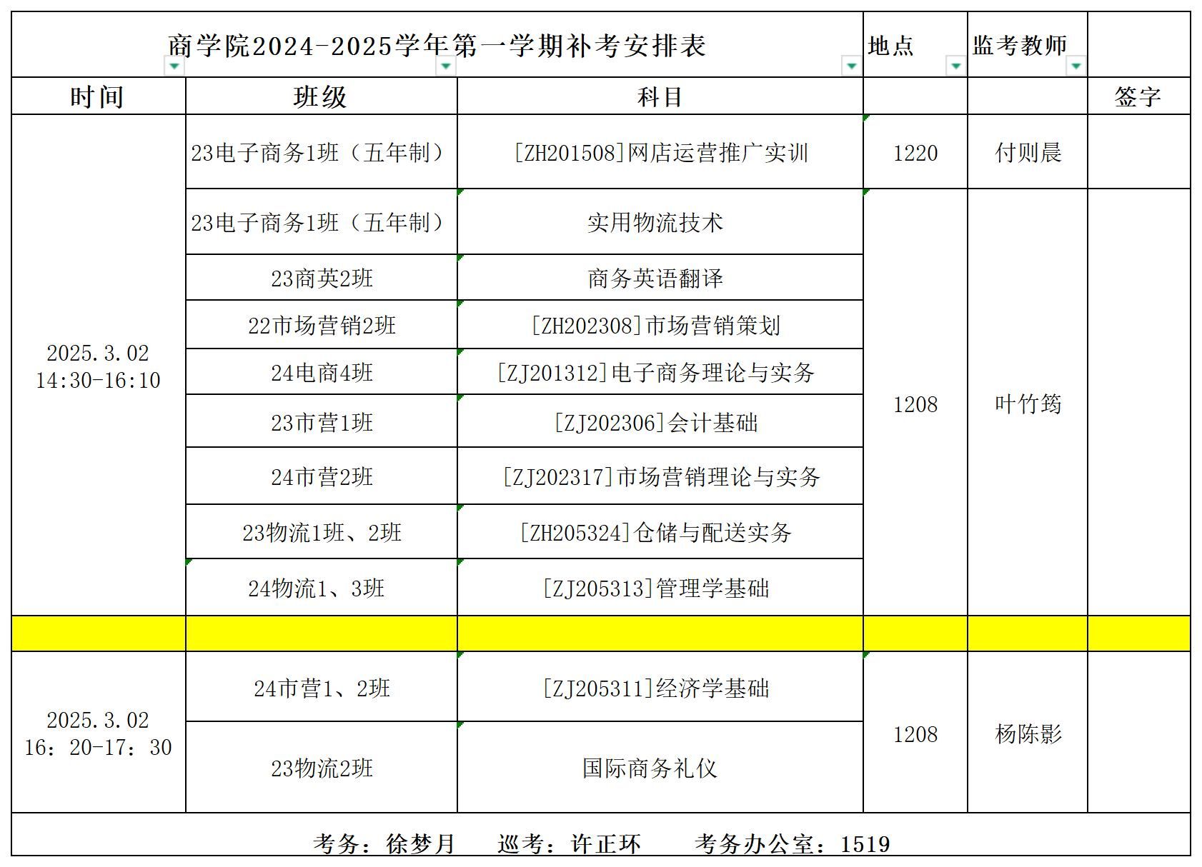 商学院2024-2025学年第一学期补考安排表