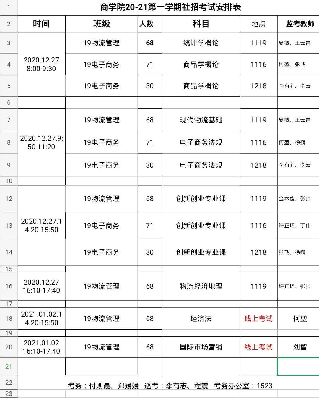 商学院20-21第一学期社招考试安排表