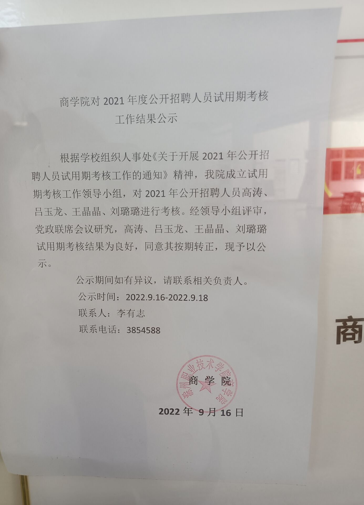 商学院对2021年度公开招聘人员试用期考核工作结果公示
