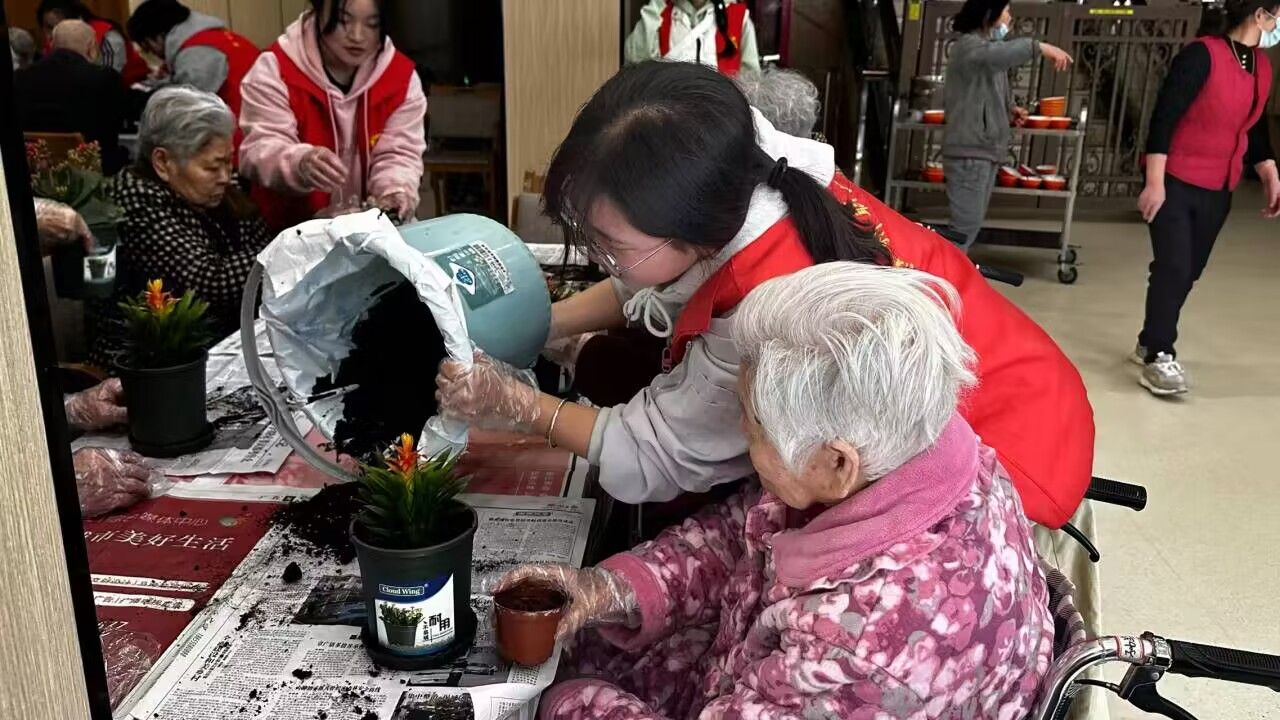 在活动开始前,学生们与老人们进行了亲切的交流与互动。活动过程中,大家分工明确,有的帮助老人清理花坛、培土,有的挖坑、种花,学生与老人们相处的其乐融融。经过一个多小时的悉心种植,一盆盆造型各异、多姿多彩的盆栽在老年人们的手中逐渐成型,看到自己亲手种下了绿色与春天,笑容洋溢在他们的脸上。