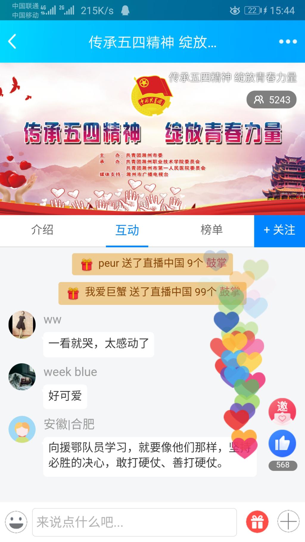 直播开始,由援鄂医护人员李苗苗、王吉文讲述他们的战“疫”故事,随后由李苗苗护士寄语当代大学生,然后作为“95后”的王吉文完成自己心愿重温入团誓词;最后由团市委孙书记诵读《五四寄语》。望我们要以援鄂医务人员为榜样,勤奋学习、增强本领,毕业后到国家需要的地方去,为祖国的建设、家乡的发展贡献自己的一份力量!