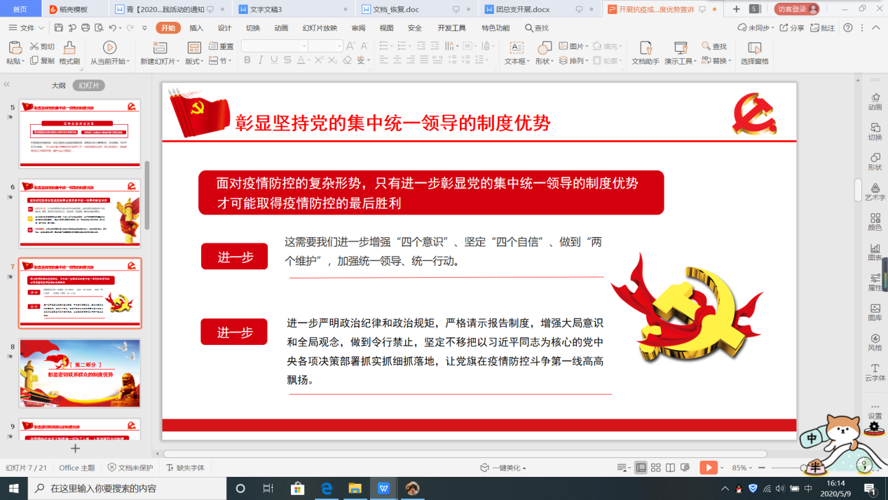王磊以用PPT的形式讲解,把“疫情下的制度自信”作为本次主题教育主题。PPT内容主要从党的领导制度优势方面,讲解了习近平总书记在抗击疫情的坚定信心,正确领导广大党员同心协力一起抗击疫情。在这场没有硝烟的战场中,中国制度是制胜的“法宝”,也是中国特色社会主义制度成功的“法宝”。
