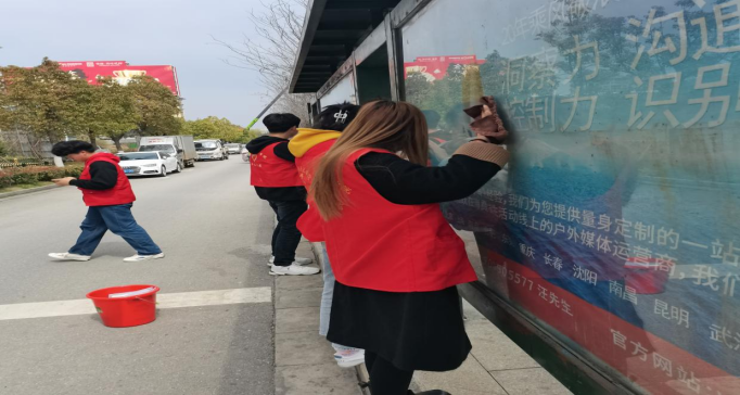 活动伊始,志愿者们领取水桶和抹布,奔赴学校西门的公交站台,开展清洁工作。大家一起抬水,细心地擦拭站牌及候车亭。在同学们的共同努力下,道路旁的垃圾没有了,站牌和候车亭的玻璃也更明亮了。
