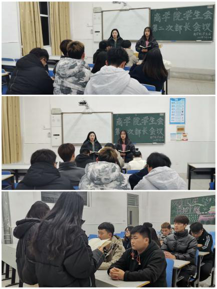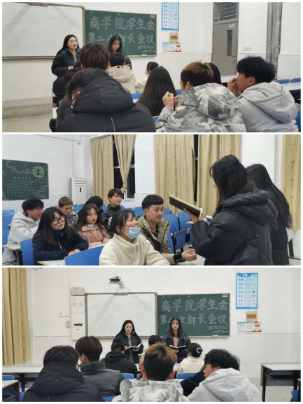 为了做好元旦晚会的准备工作,商学院学生会于11月30日在1107教室召开第二次部长会议,商学院学生会各部长参加了本次的会议。