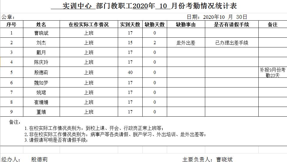 现将实验实训中心2020年10月份考勤情况公示三天。若有异议者请致电0550-3854638。