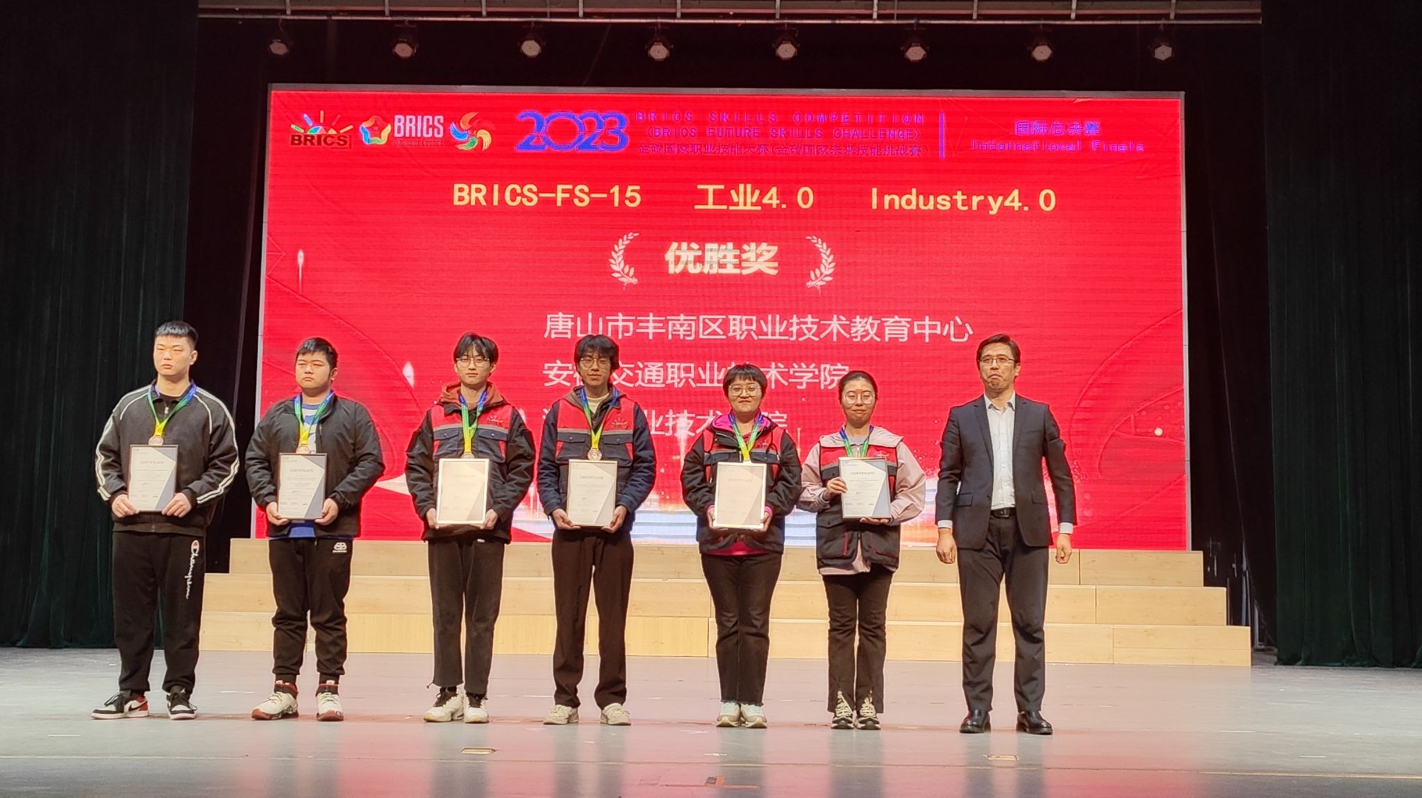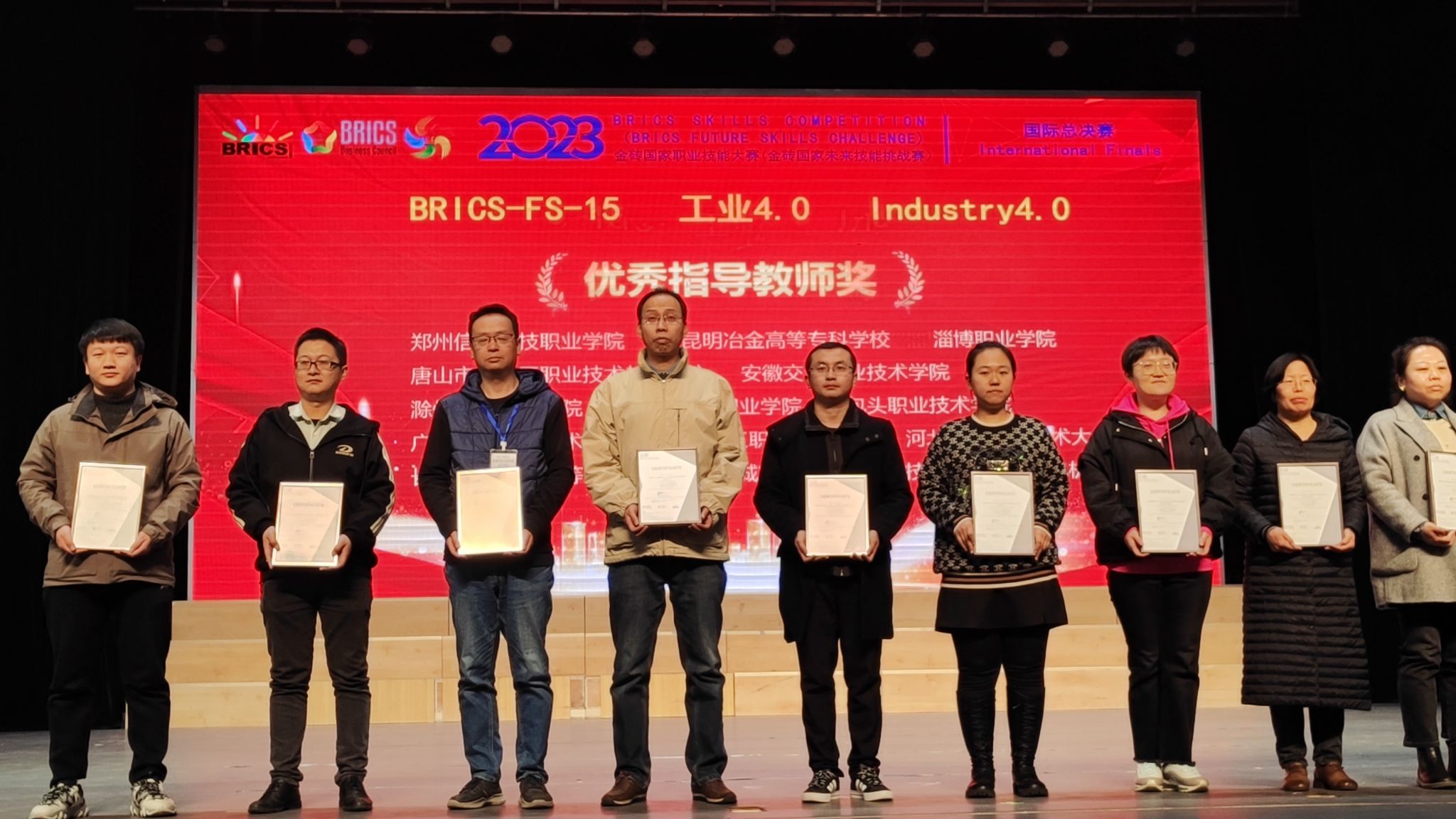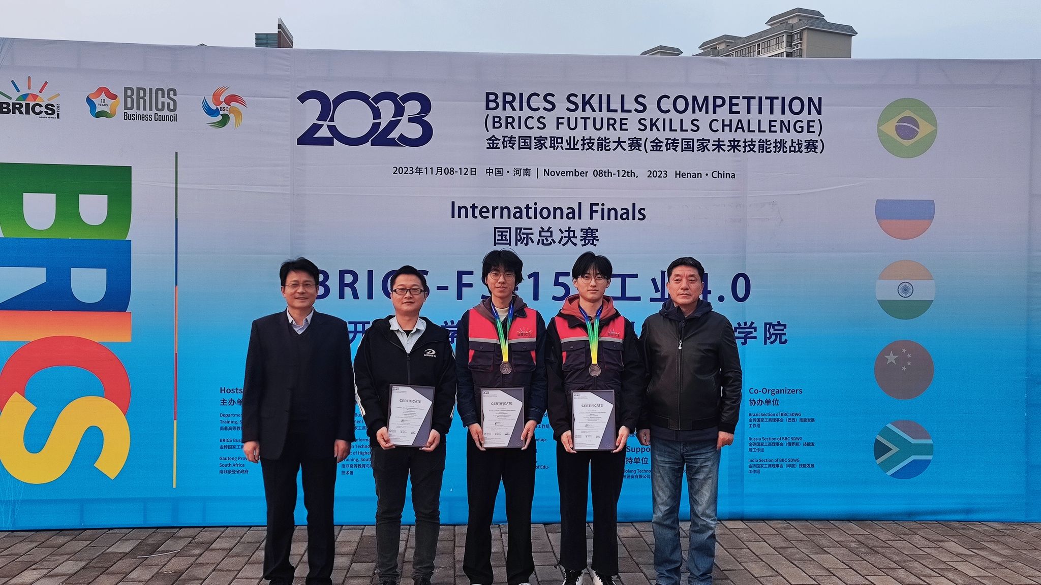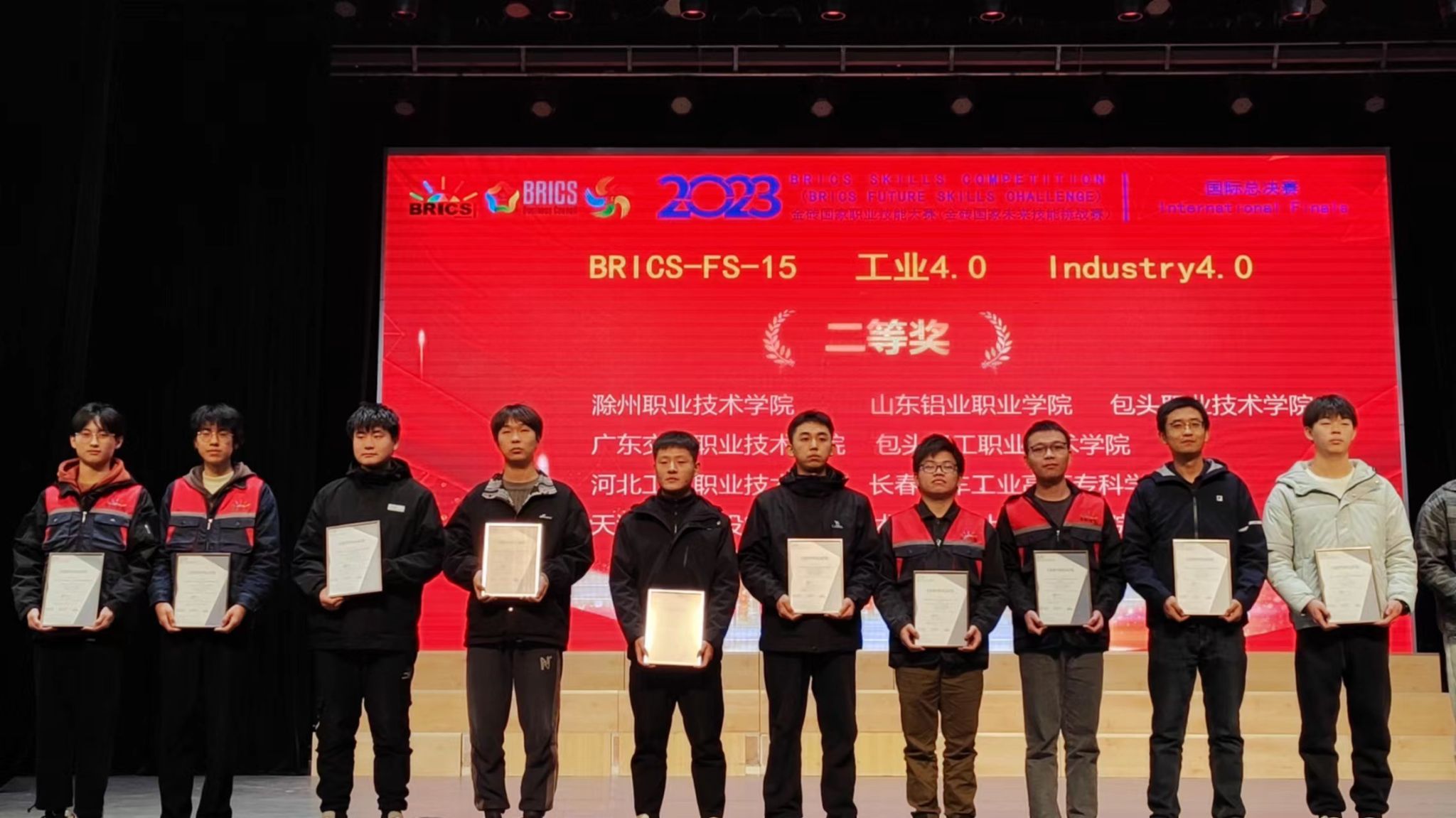 11月11日,2023年金砖国家(BRICS)职业技能大赛工业4.0赛项国际总决赛在河南郑州落下帷幕。在校党委委员、副校长苏有良,实验实训中心主任曹晓斌的带领下,教师张小光、孟杰的指导下,22机器人王辉、李孟鑫同学,沉着应战,奋勇拼搏,最终凭借全国第6名的好成绩荣获该赛项国际总决赛优胜奖;中国分赛区二等奖。张小光、孟杰荣获“优秀指导教师”,实现了学校在国际化技能大赛上的历史性突破。