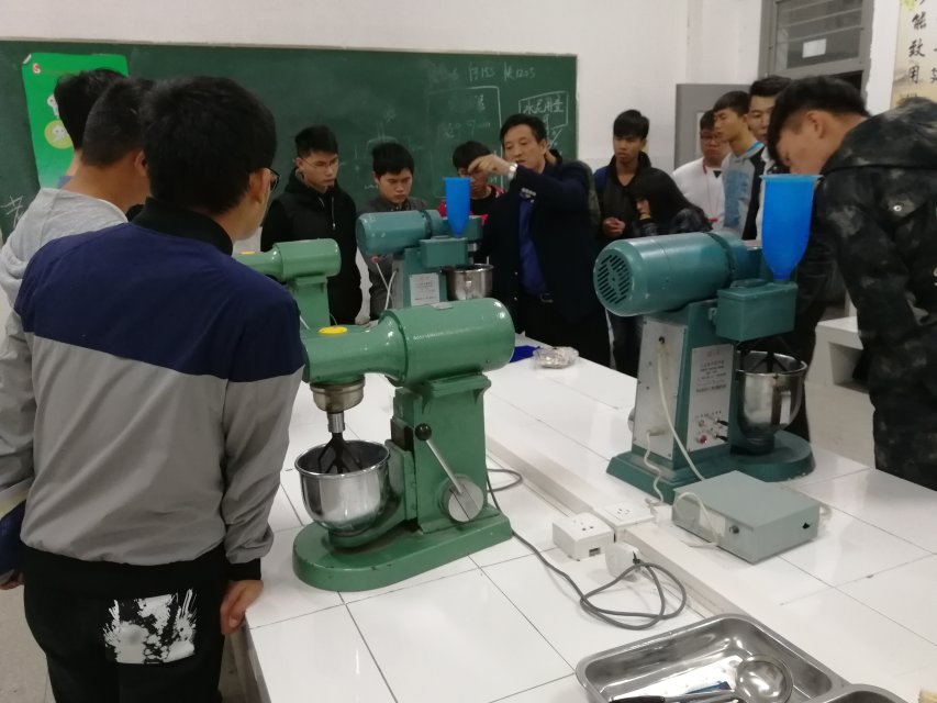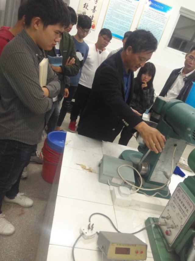 经过近两个小时的理论知识讲解后,同学对建筑材料水泥有了更深的了解。随后林祖宏老师带领着同学们参观水泥胶砂强度实验实训室。一进入实验室老师就强调安全问题,特别是对水,电以及机械设备等的使用。随后在机械设备操作的演示中说明比赛的细节问题就是要对设备的保护,切记一定要轻拿轻放,材料称量时一定要准确无误。