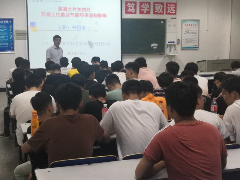 2019年6月5日(星期三)19:00,由Beat365唯一官方网站致研建材社团主办的题为《混凝土外加剂对混凝土性能及节能环保深刻影响》的学术报告会在教学楼4110室举行,土木工程系林祖宏副教授在会上做了精彩报告。建工、造价、市政、道桥及监理专业共100余名学生听取了报告。