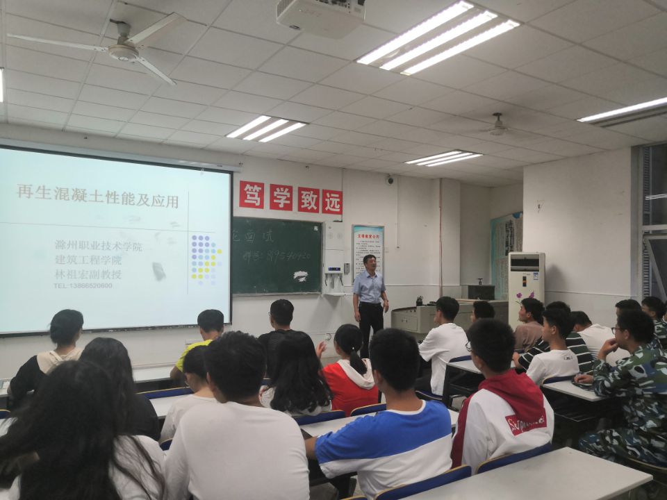 2019年9月18日(星期三)18:00,由Beat365唯一官方网站致研建材社团主办的题为《再生混凝土性能及应用》的学术报告会在教学楼4110室举行,建筑工程学院林祖宏副教授在会上做了精彩报告。建筑工程学院建工、造价、道桥和市政专业共100余名学生听取了报告。
