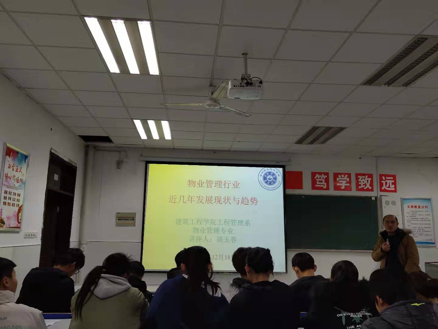 12月18日下午1点,建筑工程学院高玉春副教授在4101教室,举办《物业管理行业近几年发展现状与趋势》学术讲座,建筑工程学院物业管理专业以及工程造价专业近百余名学生参加。