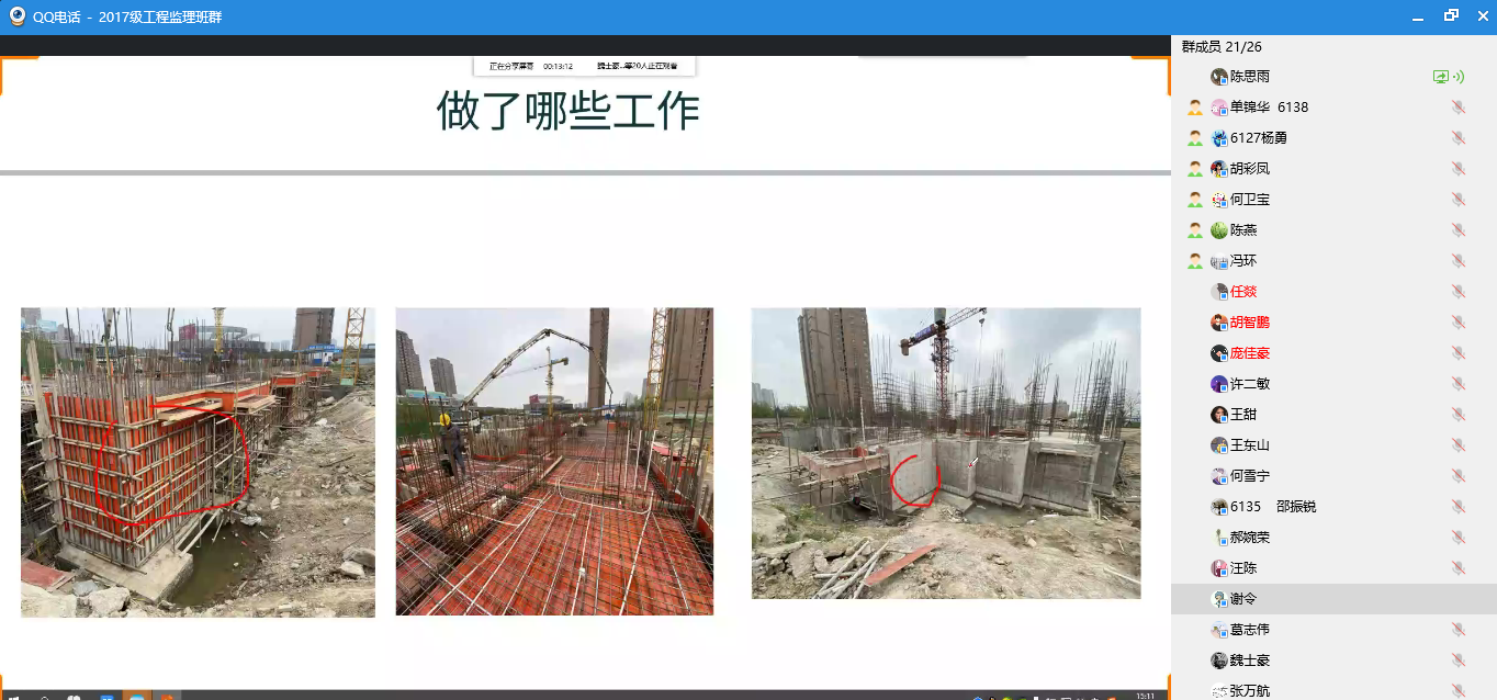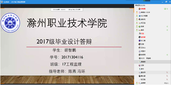 4月10日,建筑工程学院17级建设工程监理专业毕业答辩正式开始,答辩采用线上(QQ直播)进行。答辩分三个程序,首先答辩者向答辩老师提交设计文件,自我介绍,并制作答辩PPT进行在线演示,主要介绍设计内容、创新思想和心得体会;然后,答辩老师针对上交的毕业设计内容和答辩PPT内容提出相关问题,由同学线上回答,这主要是考察同学们对毕业设计内容的熟悉程度和对专业知识的掌握程度,同时增加班级学生互动。