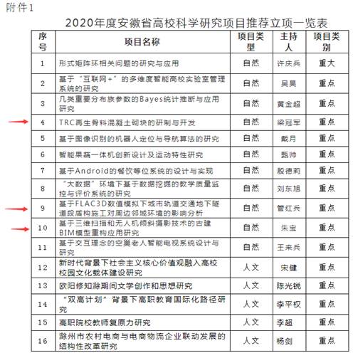 近日,2020年安徽省教育厅高校科研项目推荐立项公示中,建筑工程学院有三位老师获得省重点项目立项。其中,我院梁冠军老师的《TRC再生骨料混凝土砌块的研制与开发》、管红兵老师的《基于FLAC3D数值模拟下城市轨道交通地下隧道段盾构施工对周边邻域环境的影响分析》、朱宝老师的《基于三维扫描和无人机倾斜摄影技术的古建BIM模型重构应用研究》,均被安徽省教育厅立项为重点项目。