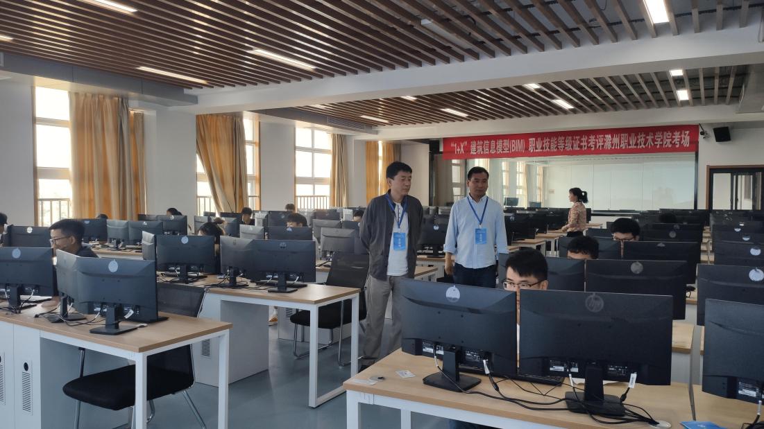 5月22日,教育部“1+X”建筑信息模型(BIM)职业技能等级证书考试在我院建筑技术综合实训馆的1+X证书试点(BIM)实训室(JG306)举行。Beat365建筑工程学院16名学生参加本次认证考试。此次考试工作组织有序、安排合理,校党委委员、副校长江洁 ,建筑工程学院院长朱永祥,校实训中心主任曹晓斌、副主任刘杰到现场指导工作。