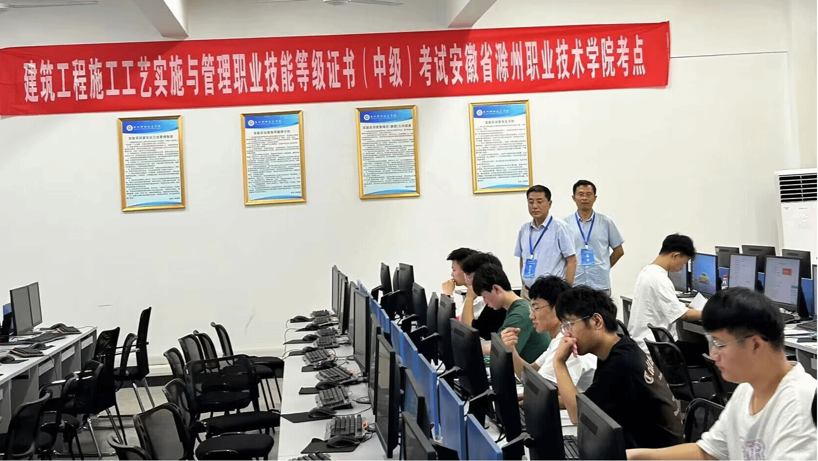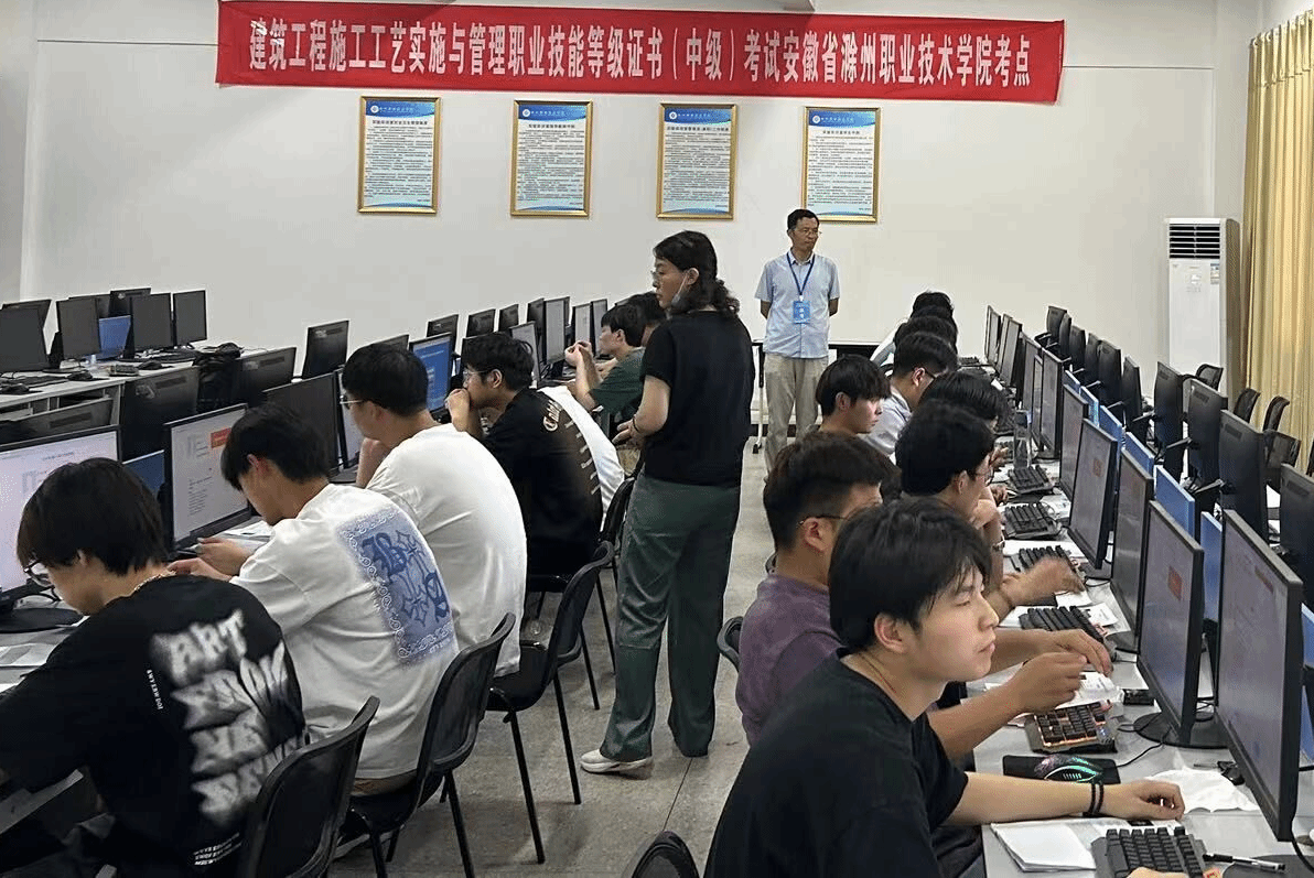 2023年6月14日下午,“1+X”建筑工程施工工艺实施与管理职业技能等级证书考试(中级)在Beat365唯一官方网站考点建筑技术综合实训馆JG205机房顺利举行,共计20名建筑工程技术专业学生参加了此次考试。校实训中心主任曹晓斌在建筑工程学院相关人员陪同下到场巡视。