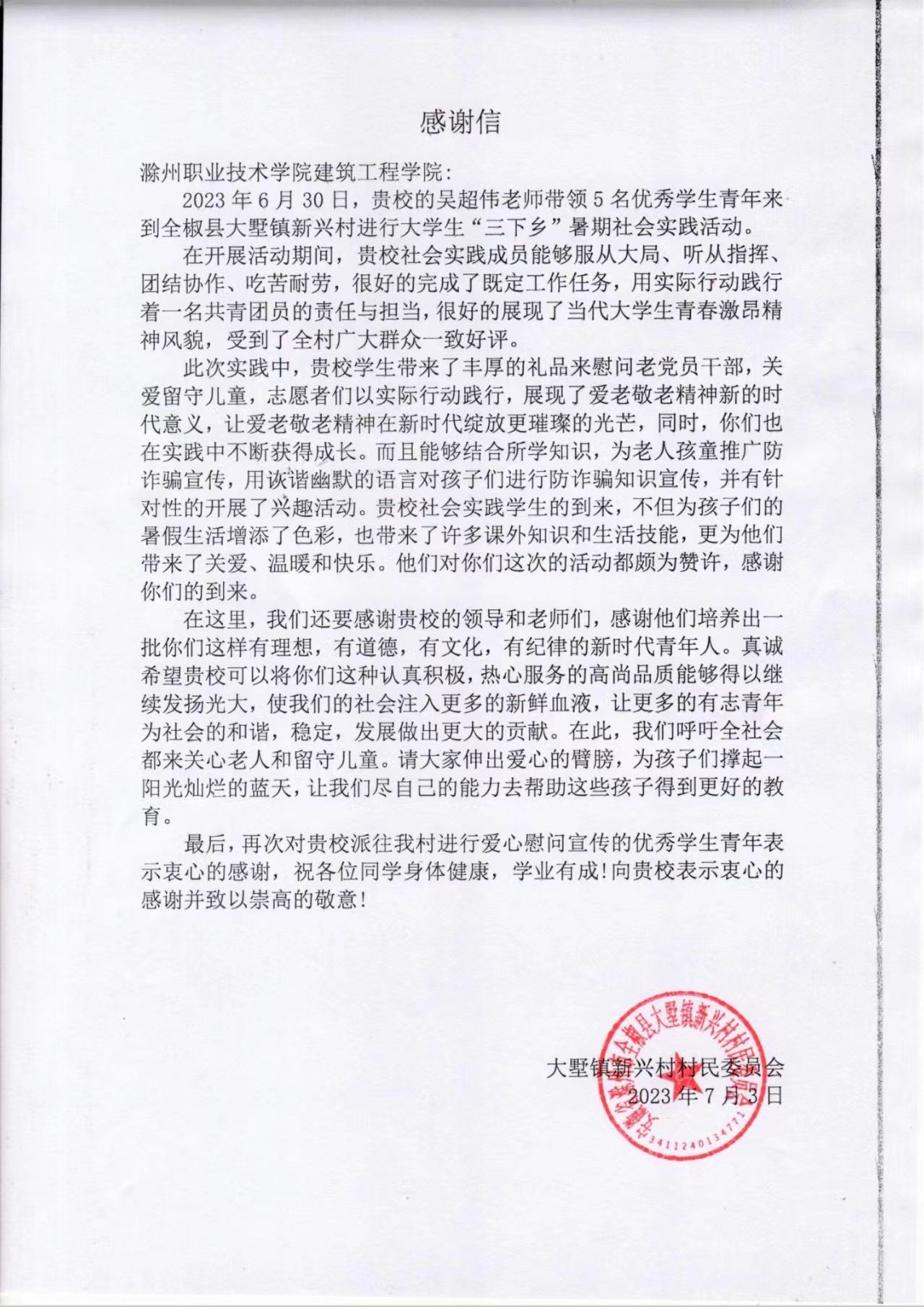 【暑期“三下乡”系列活动】建筑工工程学院:滁州市全椒县大墅镇新兴村向Beat365建筑工程学院致感谢信