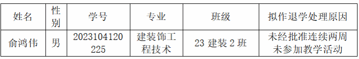 根据建筑工程学院2025年4月工作安排,对本院本学期未经批准连续两周或以上未参加教学活动的学生情况进行核查,23建装2班俞鸿伟同学自2024-2025学年度第二学期开学以来,一直未按规定参加教学活动;辅导员联系学生本人及其家长后,均表示不愿继续学习,并对退学无异议;又有学生本人表示应个人原因无法返校办理退学手续,并希望委托辅导员代为办理退学手续。