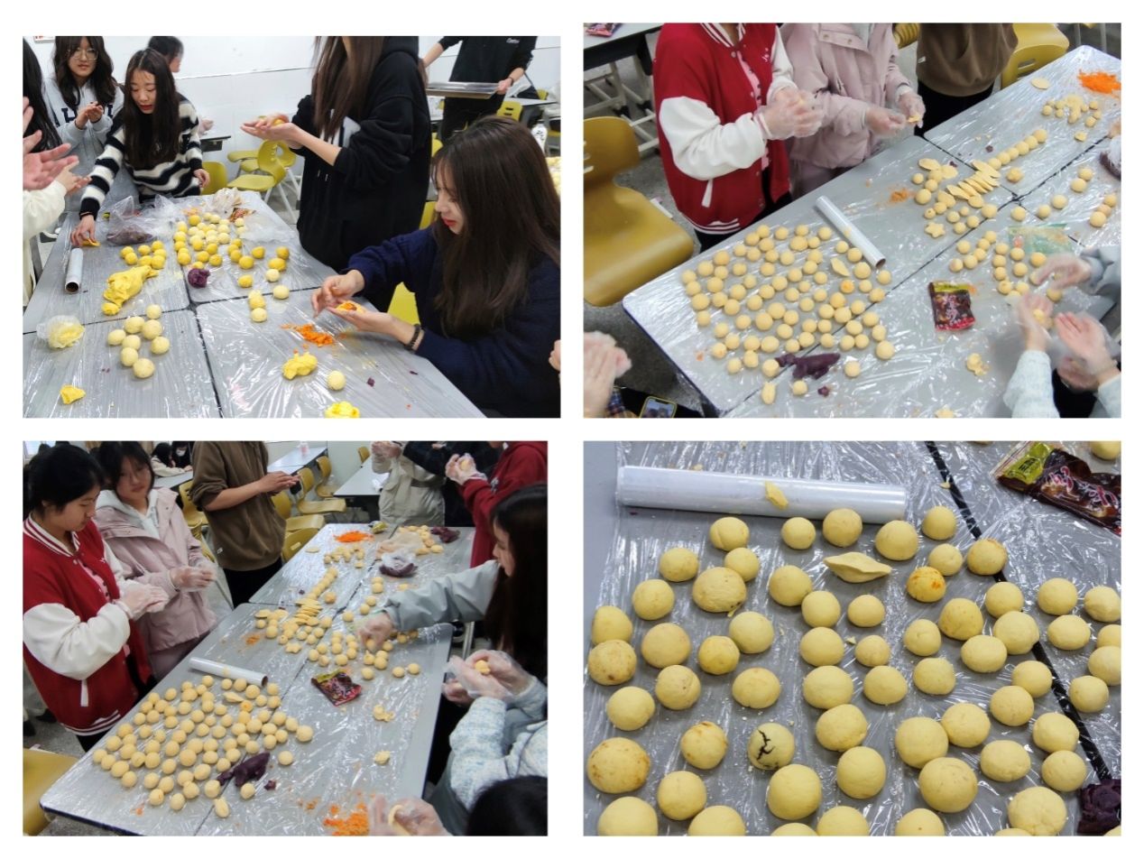 活动伊始,同学们把切碎的糯米粉、水磨粉、艾草等各种馅料按照适当的比例用手将其糅在一起,搓成长条状的面团,并切成一个个小块,分发到同学们的手中。将块状的面团压扁,挖一勺豆沙红豆等口味的馅料,在捏拢收口,搓成自己喜欢的形状并将这些青团送往食堂进行烤制,同学们的气氛欢乐热烈,就这样一个个的青团就完成了,当青团出炉后同学们吃着自己亲手做出的青团,绵糯香甜,多咬一口就能拥抱整个春天,愉悦的心情都写在了脸上。