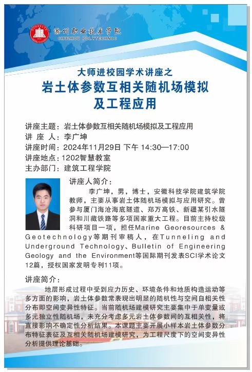 2024年11月29日下午14:30-17:00,建筑工程学院举办 “大师进校园”活动。学院邀请安徽科技学院李广坤博士在1202智慧教室为两校联合培养的土木工程专升本专业全体同学做题为《岩土体参数互相关随机场模拟及工程应用》的讲座。土木工程专升本专业的部分授课教师和辅导员参加讲座。