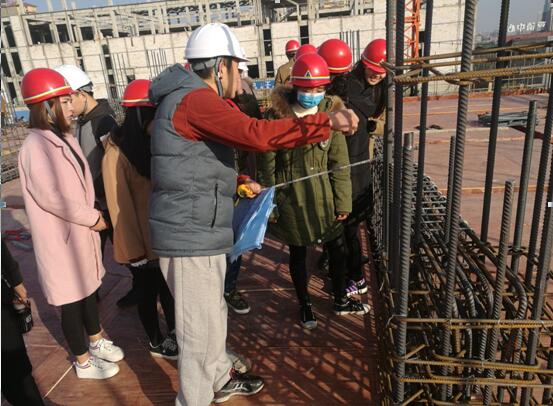 进入施工现场,蒋衡老师在给同学们进行了安全教育后带大家来到钢筋加工区,结合工人操作讲解了钢筋下料、弯曲、调直、除锈等施工工艺。接着带大家来带实训基地二层现浇面施工现场,结合工程图纸详细了讲解了框架梁和柱钢筋施工中的注意事项,蒋老师还带大家当场计算梁钢筋长度、根数,并且用尺子现场校对尺寸,使同学们真正认识到如何将课本所学知识变成实物。