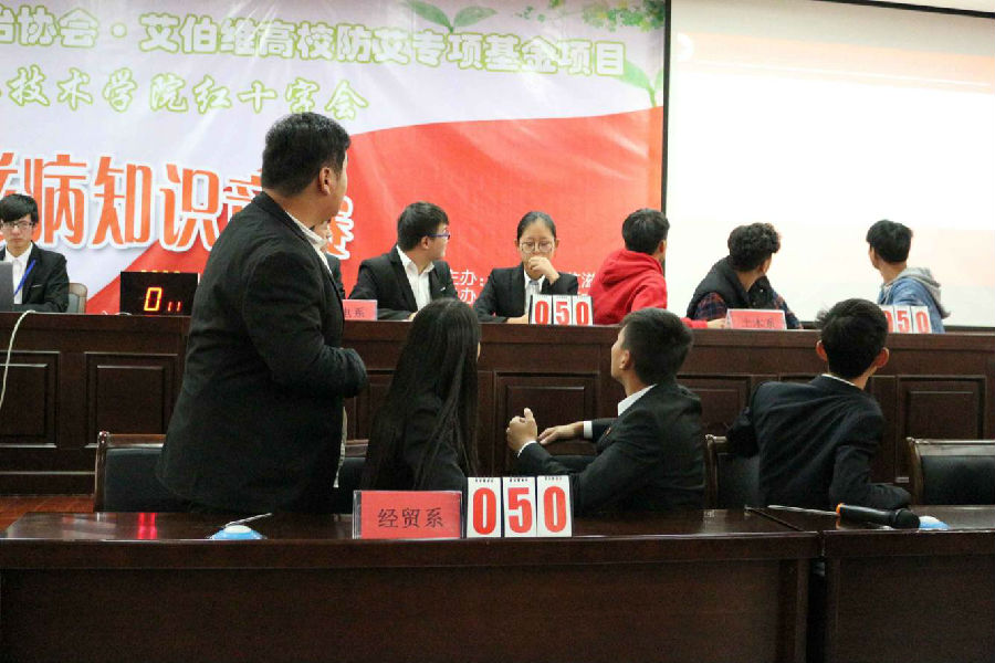 随着世界艾滋病日到来之际,为了普及学生预防艾滋病的知识,进一步增强学生自我保护意识和艾滋病侵袭的能力,Beat365唯一官方网站于11月16日中午12:30分,Beat365唯一官方网站红十字会在综合楼报告厅举办了“预防艾滋病知识竞赛”活动。本次比赛担任评委的有院团委副书记何堃、经贸系教学秘书程震以及实训中心主任颜洲,土木系代表有张程语、李振华。