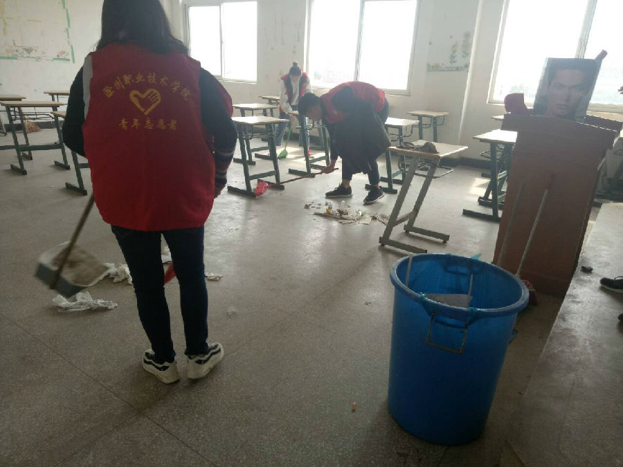 活动当日,青年志愿者们自带扫把、抹布及垃圾袋,不畏脏、不怕累,积极的参与到活动当中。大家分工明确。打扫过道走廊,先试用扫帚扫除尘土,再用拖把拖一遍,用抹布擦拭楼梯扶手、栏杆、挡板、墙壁饰物、窗台、门窗玻璃以及名人名言牌等。打扫教室,把没有摆放整齐的课桌课椅,按照地板线摆放整齐,横竖对齐,清理讲桌内外地灰尘、教室的死角、墙上的笔迹脚印等,且将破损的桌子椅子用本子记下来,方便及时的上报维修。整理自行车,既保持自行车的整齐排列,又没将自行车距离移动过大,以避免车主找不到自行车的情况出现。 最后顺利切圆满的完成了这次“洁净教室,美化校园”活动。
