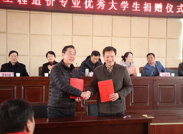 会上,史正海宣读了捐资单位和受捐助学生名单。随后捐资单位向受助学生代表发放了资助金。捐助现场,市建设工程造价管理协会会员单位(企业)共捐赠43000元,资助了43名土木工程系学生。与会领导为捐赠企业家颁发了捐赠证书。李柱梁书记向张正金、郝勇等6位客座教授颁发了聘书。张正金、刘文元分别代表市造价站党总支和建筑工程学院党总支签署党总支结对共建协议。