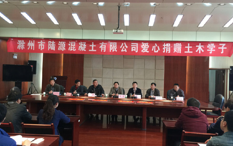 近日,滁州市陆源混凝土有限公司爱心捐赠土木系贫困学生的仪式我院11楼会议室举行。副院长汪上、程一斌、土木系主任朱永祥、书记刘文元以及受助学生和各个班级代表参加了仪式。