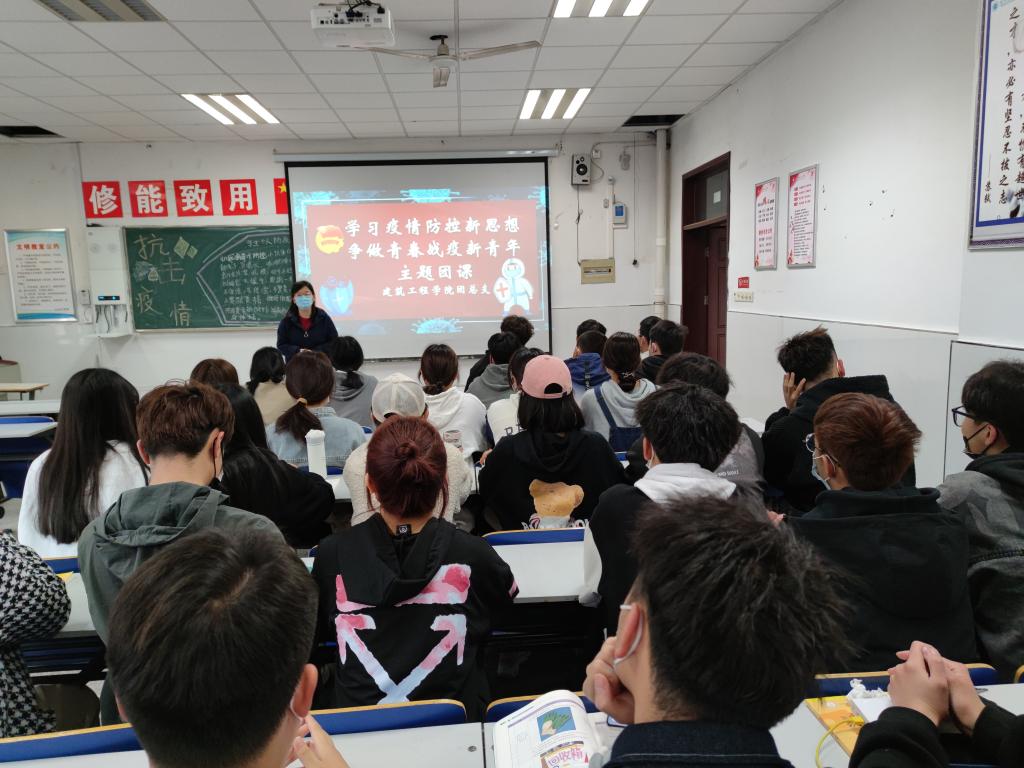为贯彻落实学校党委疫情防控工作决策部署,在疫情防控歼灭战中充分发挥共青团生力军和突击队的作用,进一步凝聚人心,汇聚力量,提振信心,科学防疫,坚决打赢疫情防控歼灭战,进一步强化学生防疫意识、持续深化同学们对于当前疫情防控形势的认识,引导青年展现担当作为,自觉遵守校园疫情防控措施,3月30日,建筑工程学院团总支书记谭康慧为青年讲授了一堂题为“学习疫情防控新思想 争做青春战疫新青年”的主题团课。