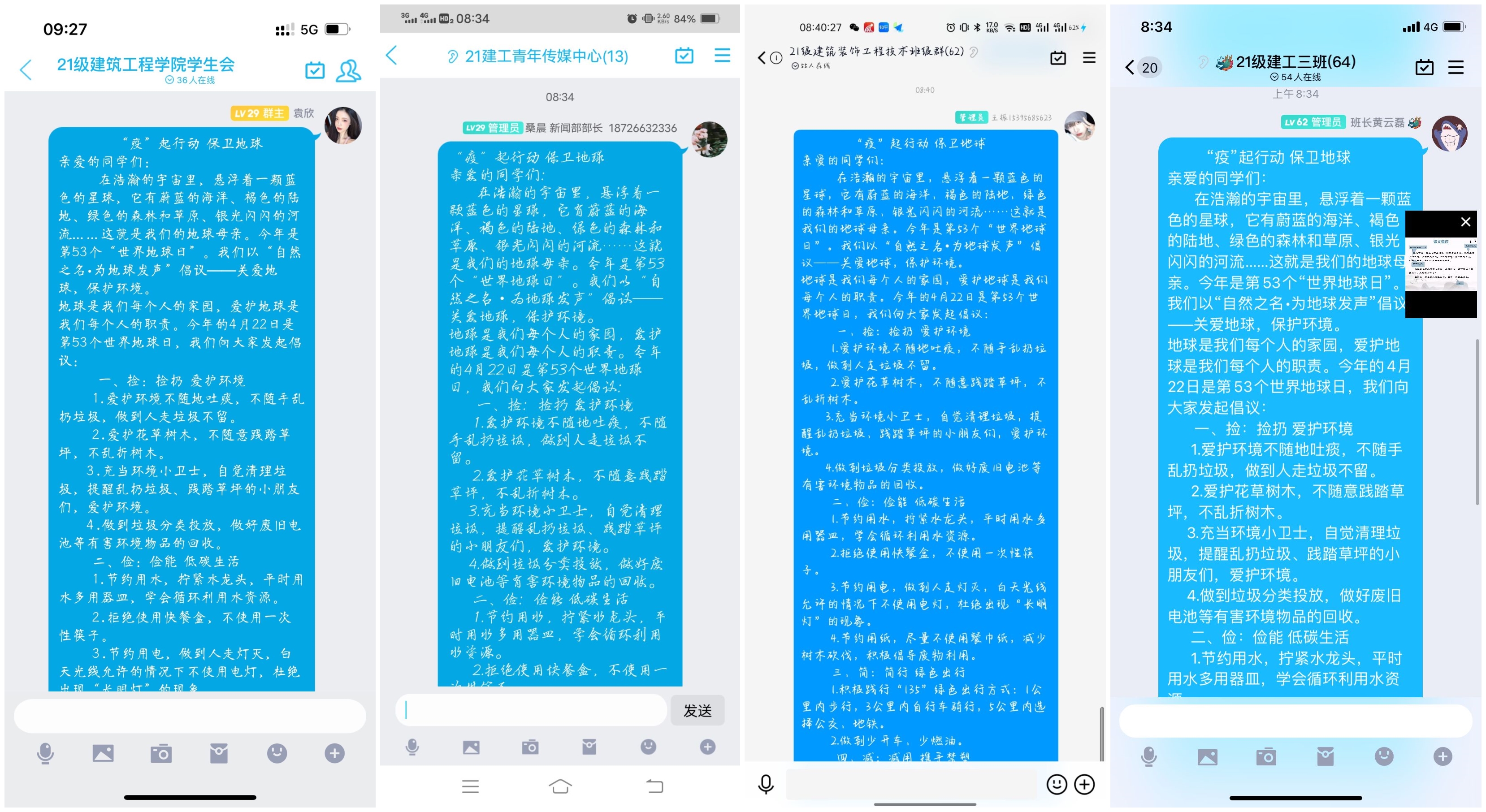 学院团总支、学生会通过班级群、学生干部群、主题团日活动等方式线上线下为保护地球发出倡议,号召同学们参与环保,与环保同行。倡议书中阐述了保护地球环境的重要性,引导同学们积极参与到节约资源,绿色生活的行动中来,共同呵护人类共同的家园。此次倡议的发出,提高了同学们的环保意识,取得同学们的支持。