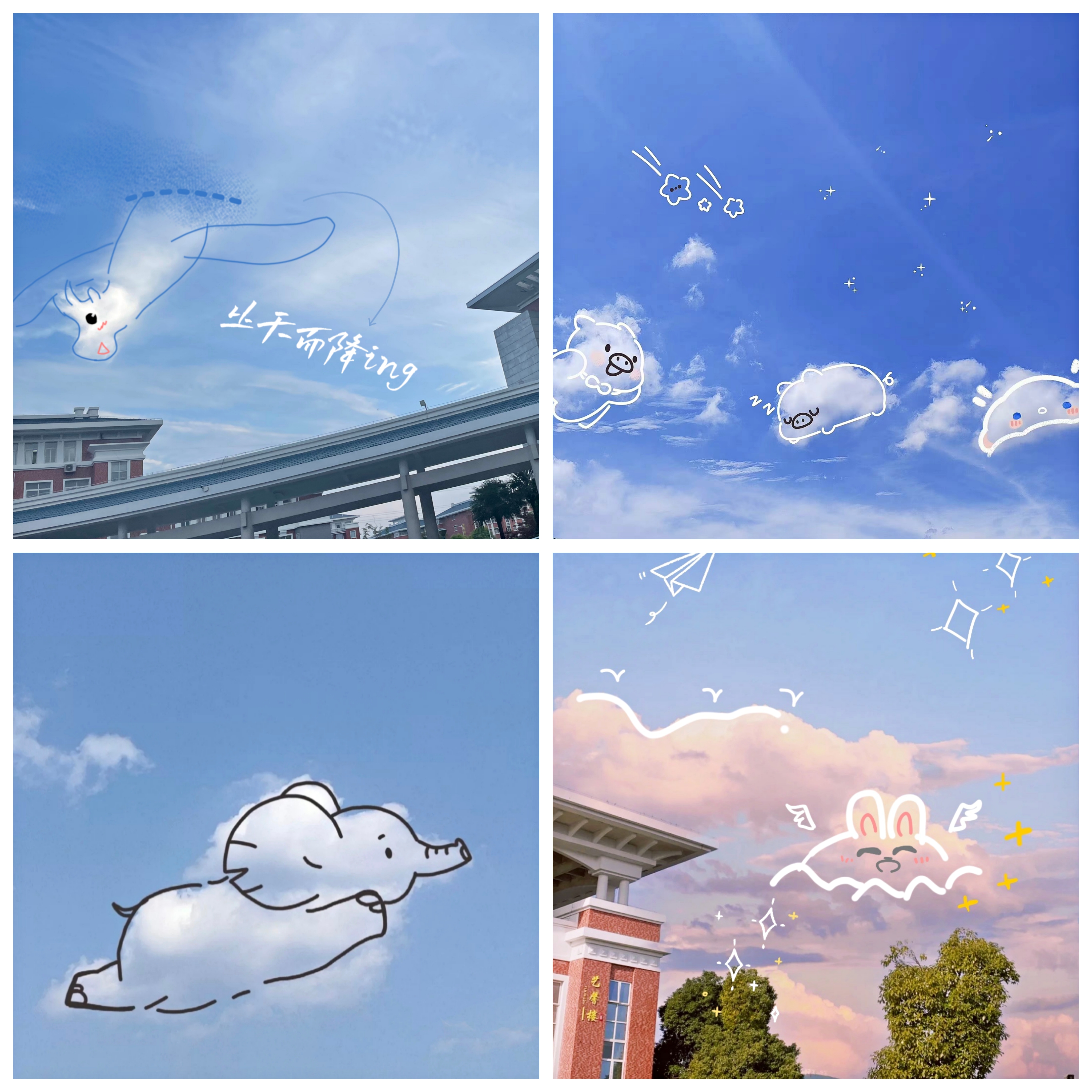 活动发出,同学们都踊跃参与。积极举起手机定格下校园内天空的独特瞬间,利用美图秀秀、醒图、ps等修图软件在拍下的照片上进行绘画涂鸦。抬头、定焦、成像,画笔轻描,云朵便有了更加具体有趣的模样,每一朵云朵都有着它们不一样的故事,同学们用各自独特的视角,描绘着心中最美好的画卷,用独具匠心的构思与创意,让创意的翅膀在云朵中遨游。