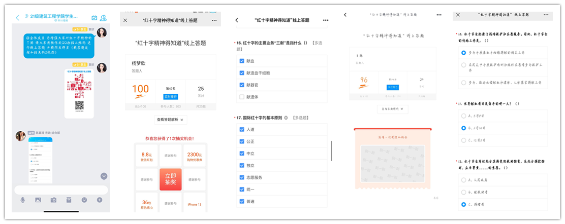 结合学校疫情防控,本次活动采取线上线下相结合的方式开展,以题促学、以学促知、以知促行,有效增强同学们的参与感。通过海报、问卷星在线答题等形式广泛宣传红十字志愿服务活动、无偿献血、捐献造血干细胞、遗体与人体器官捐献、应急救护等知识,让广大同学了解“三救三献”,增强学生对红十字知识的了解,宣传红十字精神。