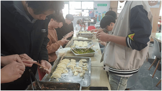 活动中同学们齐聚食堂,分工协作,切菜、和馅、擀饺皮,动作姻熟,有条不紊。经过两个多小时的共同努力,包出了一排排白白胖胖的饺子,经过后续的加工,一碗碗热气腾腾的饺子出锅了,同学们吃着自己包的饺子,脸上都洋溢着满足的笑容。学校食堂解经理非常支持同学们的这次活动,提供了许多帮助。学生们也端上自己做的饺子和解经理与食堂阿姨分享成果。