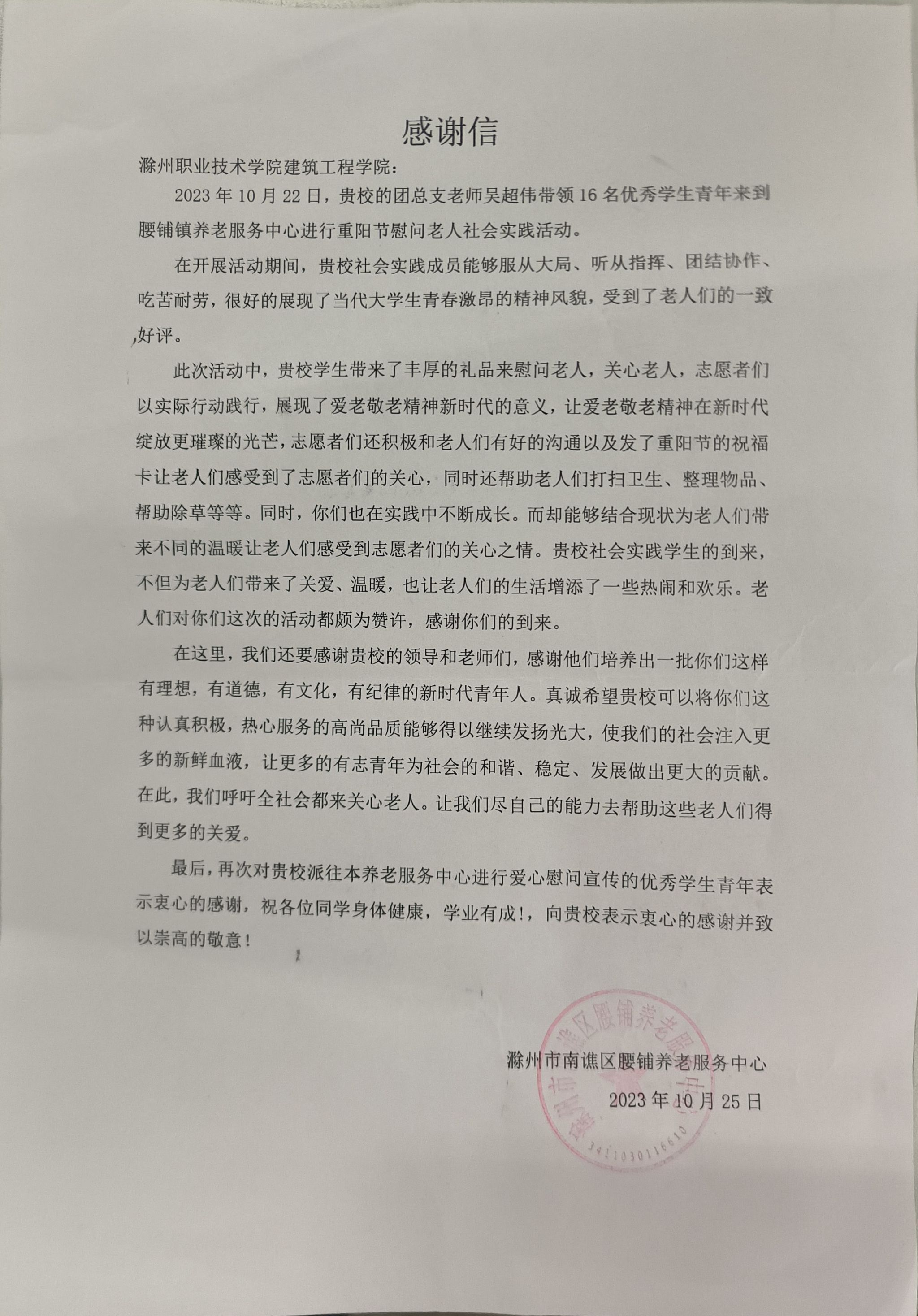 近日,滁州市南谁区腰铺养老服务中心向Beat365建筑工程学院致感谢信,对Beat365建筑工程学院表示衷心的感谢并致以崇高的敬意。