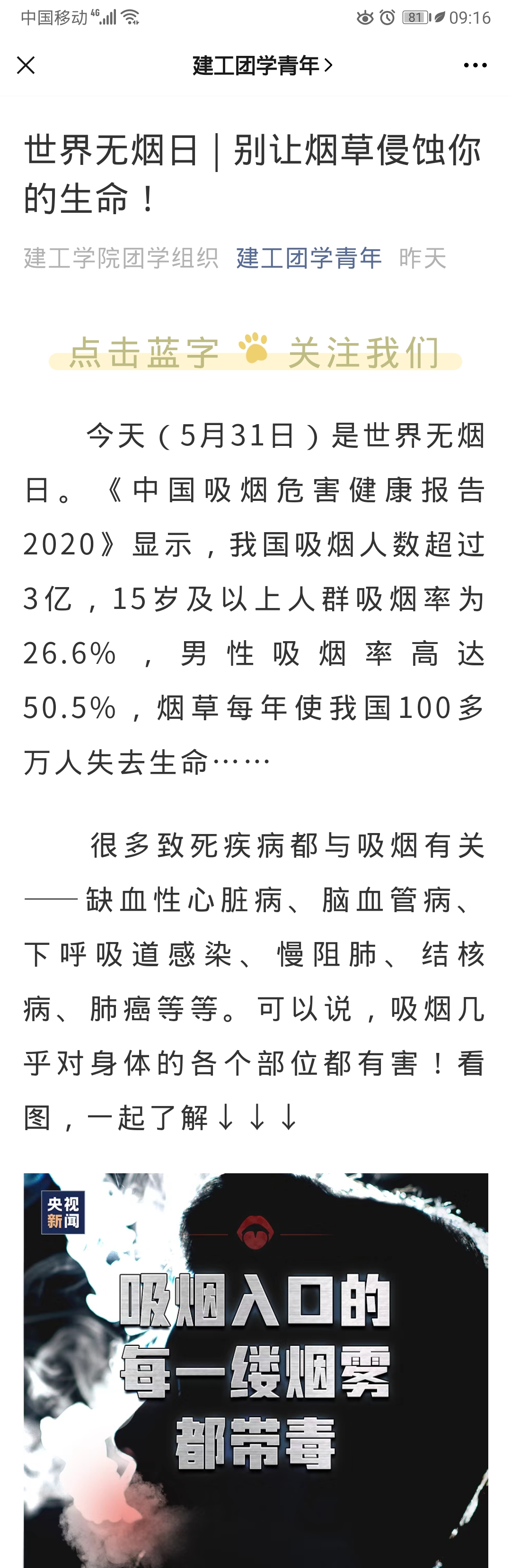 “无烟校园、清新一片”校园禁烟宣传活动通过微信公众号推送、志愿服务、文明劝导等线上、线下相结合的方式,向全院青年学生发出校园无烟倡议,引导和告诫青年学生要远离烟草。同学们纷纷响应,形成了良好的校园禁烟氛围。